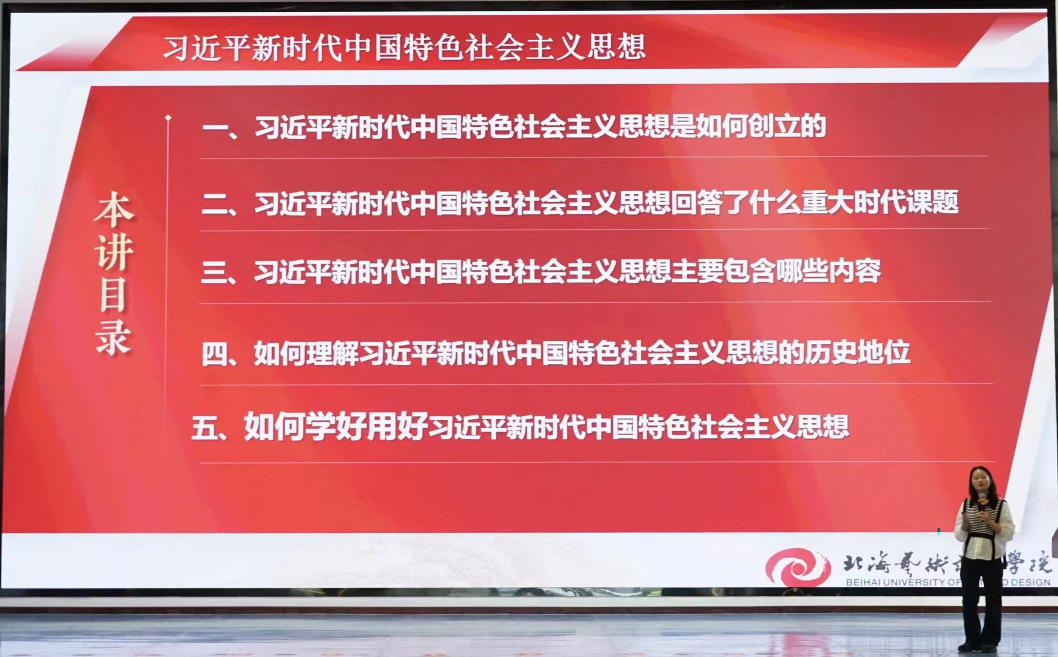 接下来进入仪式第四项,由马克思主义学院汪陈晨老师进行专题教学,她为在座学员详细介绍了习近平新时代中国特色社会主义思想。包括习近平新时代中国特色社会主义思想的创立背景、时代课题、主要内容、历史地位以及如何将理论与实践相结合。