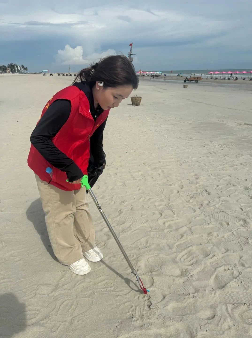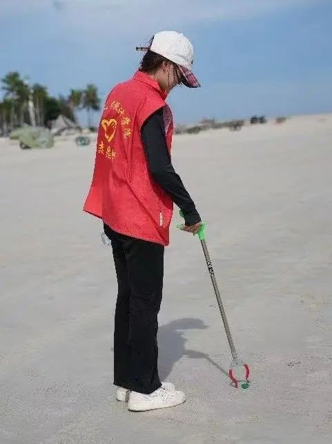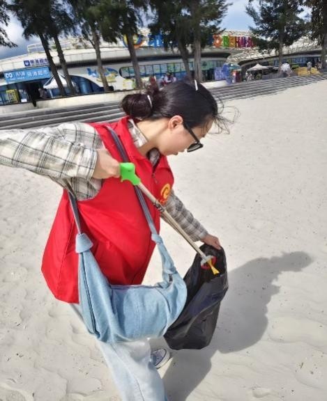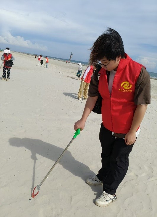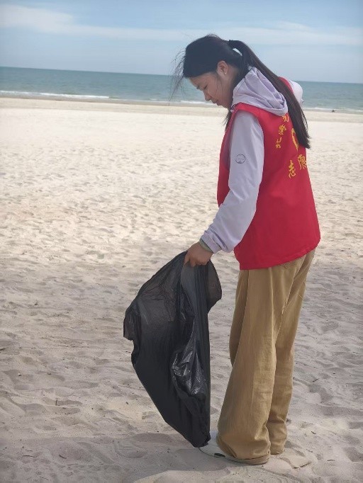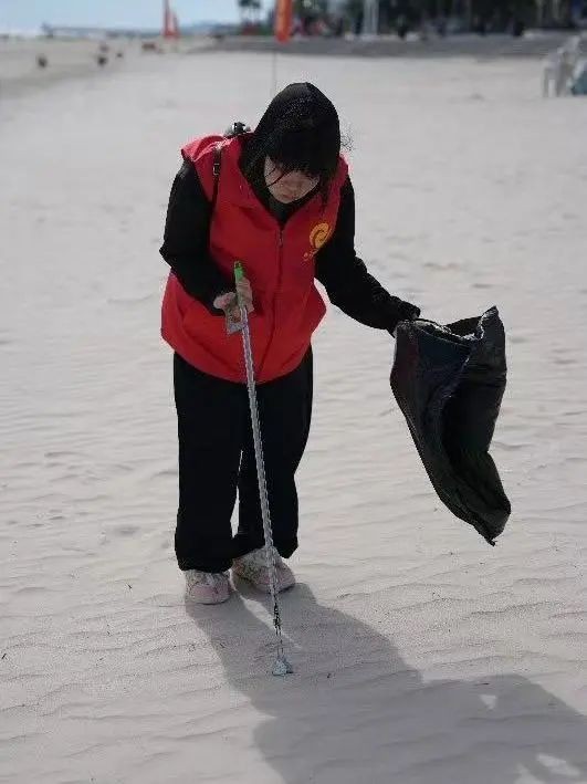 活动当天,在老师的分工下,各组领取清洁工具,为净滩行动做好充足准备。抵达银滩后,志愿者们迅速分头行动,手持工具,仔细搜寻每一处角落,将海滩上的塑料瓶、碎纸片、果皮等废弃物逐一“收入囊中”。他们互相配合,弯腰、捡拾、分类……动作重复却充满力量。烈日炎炎下,汗水浸湿了衣衫,但大家的热情丝毫不减。