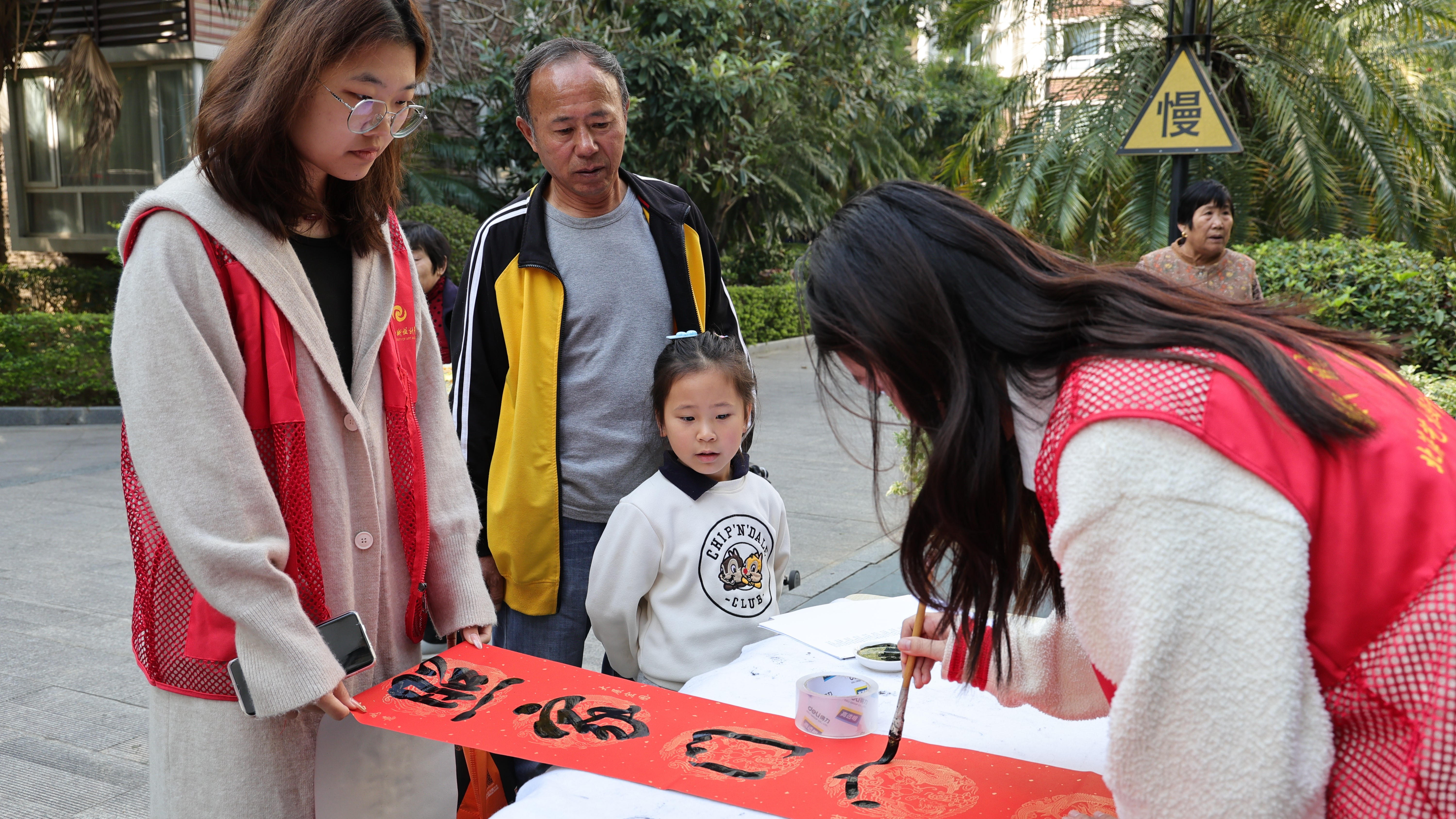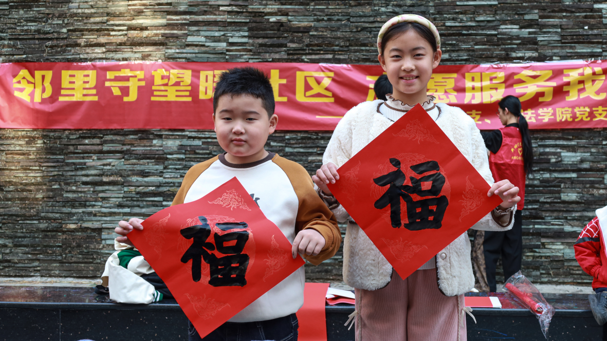 活动现场,气氛温馨又热烈,师生们热情洋溢,挥毫泼墨,随着笔锋的运转,一幅幅字体灵动、苍劲有力的新春对联与“福”字跃然纸上。居民们精心挑选内容心仪的春联,美好祝愿凝聚于纸张之间,感受着生活的美好与希望。