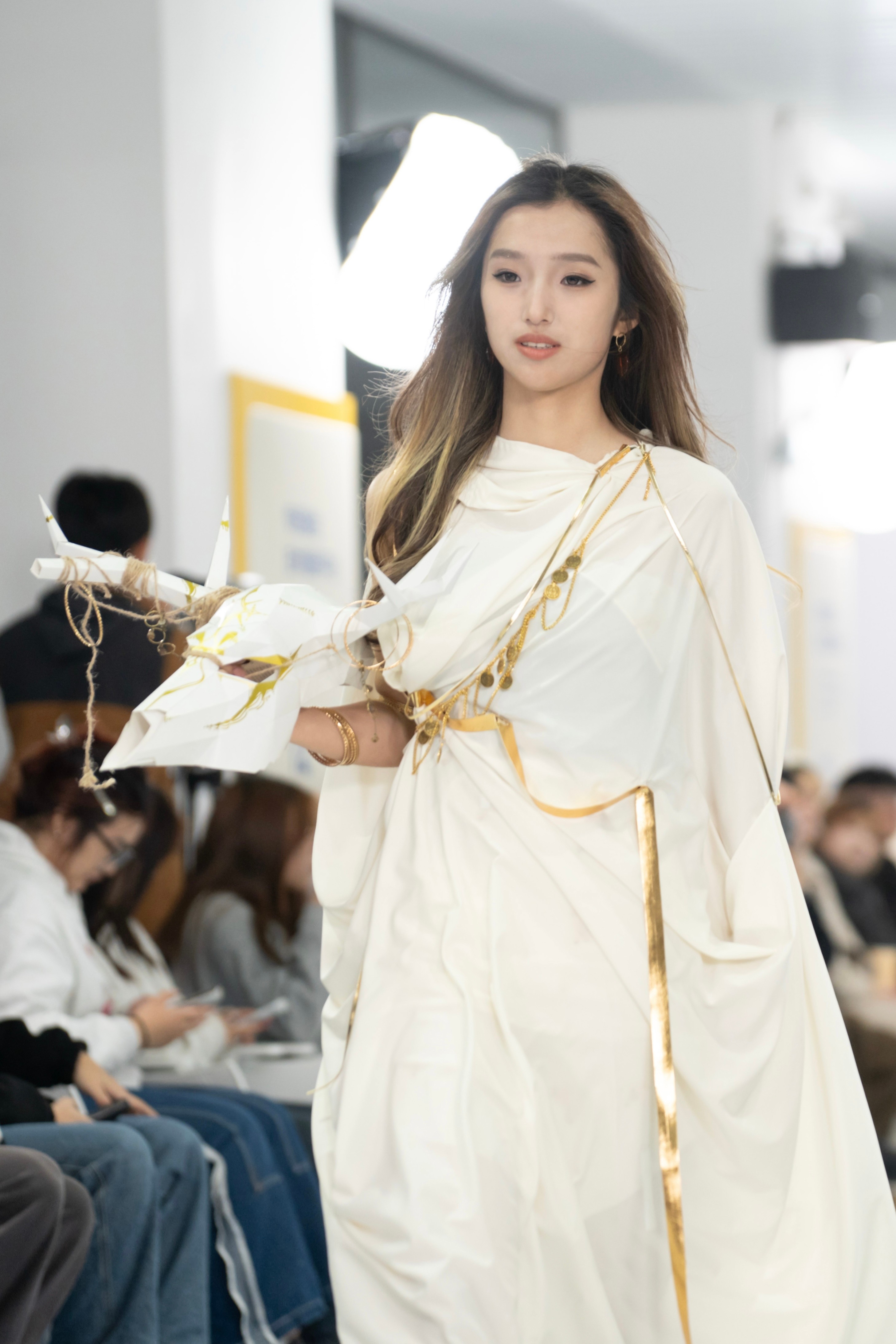 秀场结束后,2024级参展学生黄诗琪分享了其设计灵感。她表示,本学期的学习让她注重审美、理论与实践的结合,创作出既美观又实用的服装。此次设计主题为“白梦”,寓意着纯洁与无限可能。她希望作品能唤起人们对美好生活的追求,并表达简约个性的生活观。在材料选择上,她强调可持续性,用天然纤维和回收的快递包装袋,使废弃塑料制品重获新生、物尽其用,让观众在欣赏设计的同时,也能感受到对环境的尊重和保护。 每一件作品都承载着学生设计师们的心血与梦想,每一针每一线都诉说着他们的故事与创意。通过这场时装秀给大家带来了不一样的视觉盛宴,同时也给服装学院的学子在专业上带来了自信与热情,使他们在时尚的道路上越走越远。