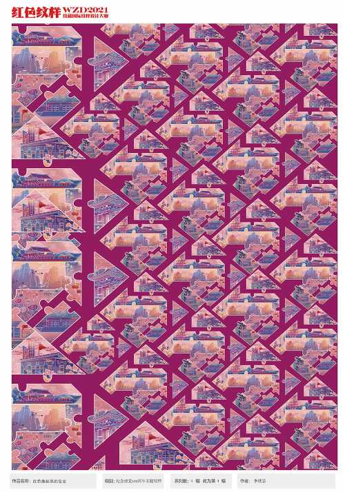《红色地标里的党史》系列纹样设计以拼图的形式去描绘党的艰辛历程和一路走来的艰难险阻。整体运用了中国风的风格,底图采用中国传统纹样做背景,象征着中国民族的精神,虽饱经沧桑、历经风雨,但如今依然屹立在世界民族之林。纹样以江西、延安、北京、上海等众多红色革命根据地拼接而成,是中国共产党革命精神的象征,即对理想和信念执着追求的力量之源。我们坚信中国共产党将继续带领中华民族走向繁荣。