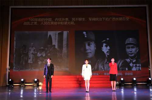 第一篇章“革命烽火耀八桂”,故事分享《广西革命星火,从梧州照耀八桂》《为革命牺牲一切的农民领袖——韦拔群》《悲壮史诗 湘江战役》《用生命向党报警——“七九”实践三烈士》,把人们的记忆瞬间带入了那个波澜壮阔的革命年代。《红船》《敬告同胞书》《血战湘江》《我爱这土地》等歌舞节目,展现了中国共产党人勇于追求革命真理,在残酷的斗争环境中浴血奋战、百折不挠,最终取得了新民主主义革命的伟大成就的奋斗历程,让现场师生更加清楚的知道,革命先辈的伟大,而今幸福的不易。