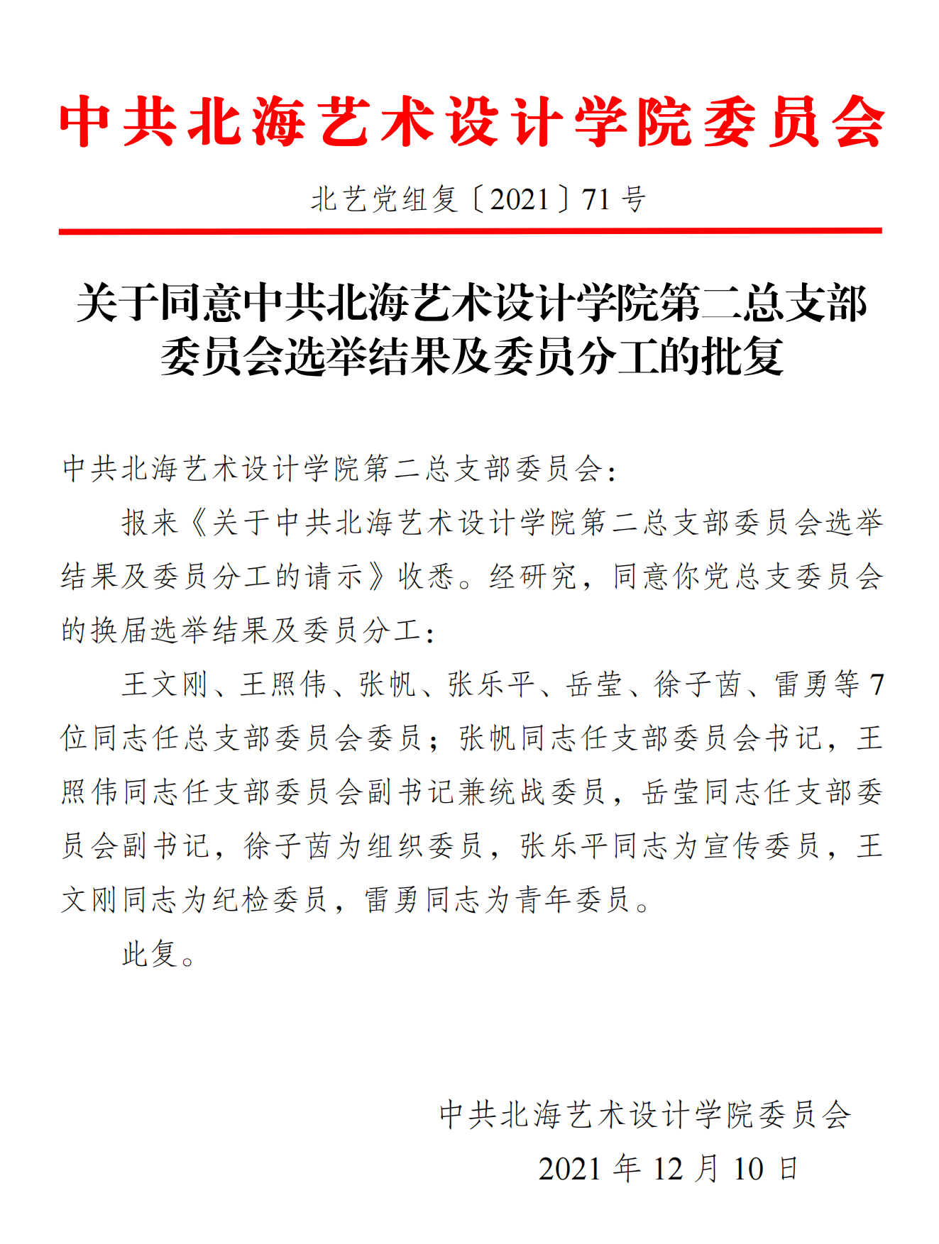 转发学校党委《关于同意中共北海艺术设计学院第二总支部委员会选举结果及委员分工的批复》