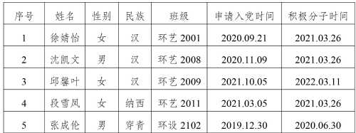 在征求党小组和党员、群众意见的基础上,经支部委员会审查,拟将徐婧怡等5位同志列为发展对象人选。根据发展党员工作有关要求,现将其有关情况公示如下,经党支部培养教育和考察,该同志已基本具备党员条件,在征求培养联系人、党员和群众意见的基础上,经中共北海艺术设计学院建筑与环境艺术学院学生第一支部委员会2023年3月12日讨论同意列为发展对象人选。