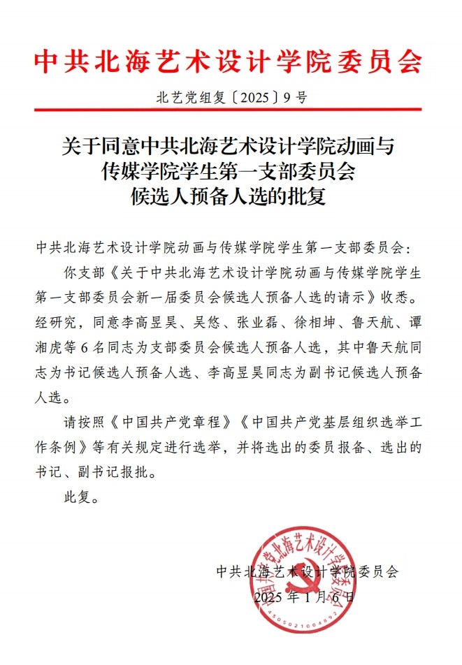 关于同意中共北海艺术设计学院动画与传媒学院学生第一支部委员会候选人预备人选的批复
