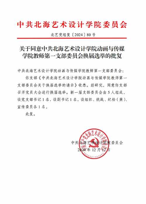 关于同意中共北海艺术设计学院动画与传媒学院教师第一支部委员会换届选举的批复