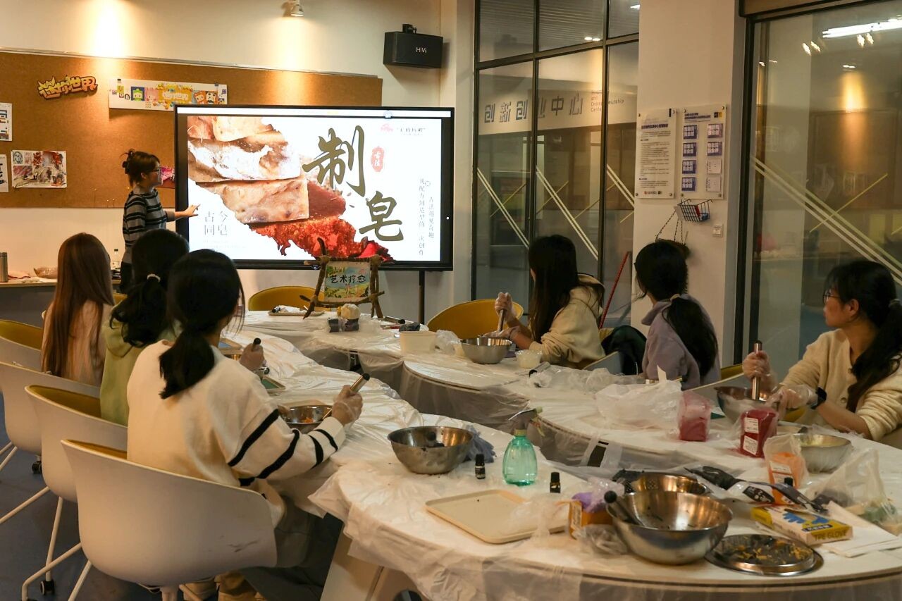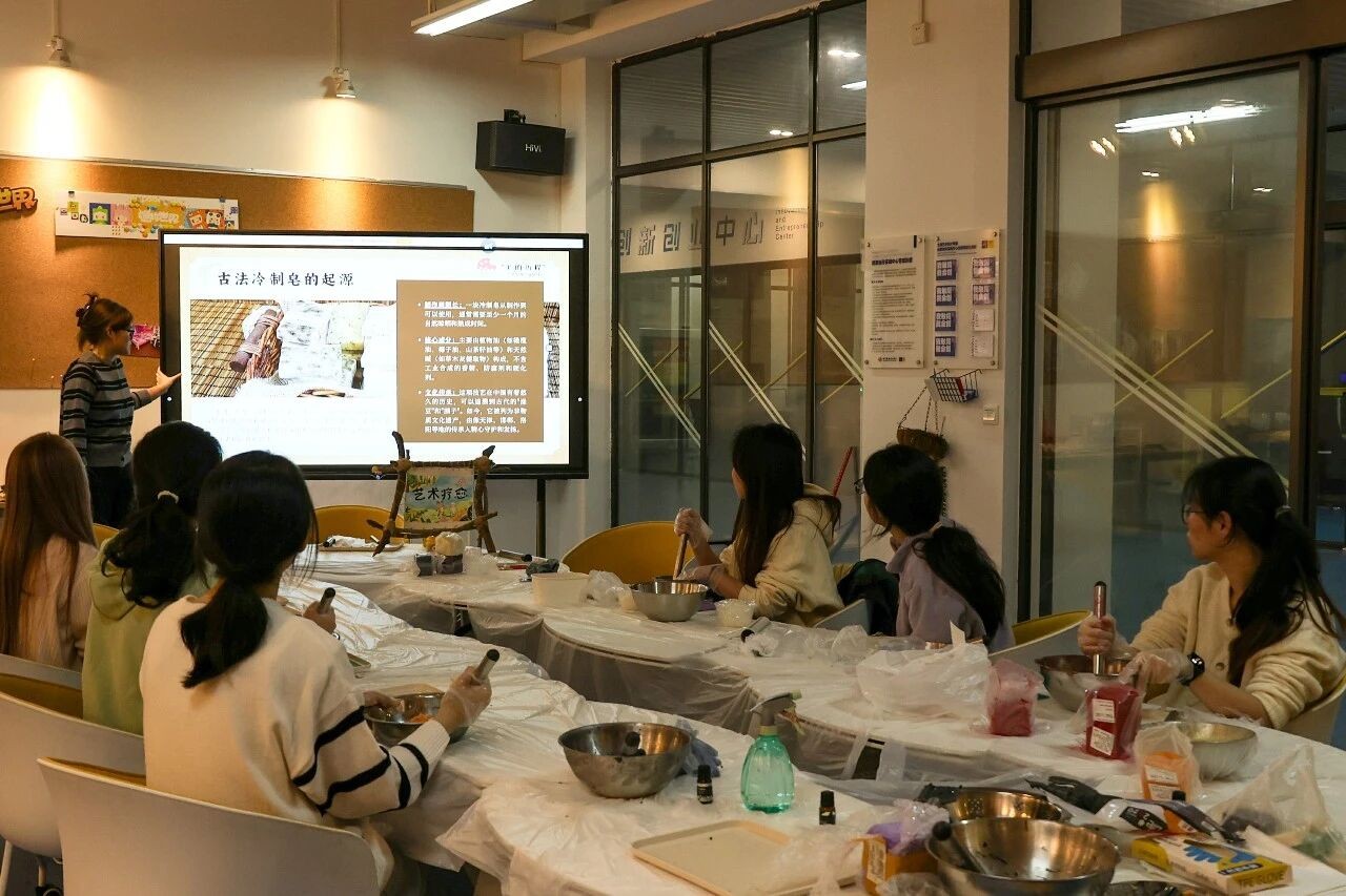 12 月 16 日下午,由我校大学生创新创业训练计划项目“美的历程——艺术疗愈公益项目”团队策划的“古今同皂”非遗古法制皂体验活动,在西校区图书馆负一楼顺利开展。活动创新融合非物质文化遗产传承、手作艺术实践与心理疗愈功能,引导参与者在沉浸式体验中实现文化感知与自我观照的双重收获。
