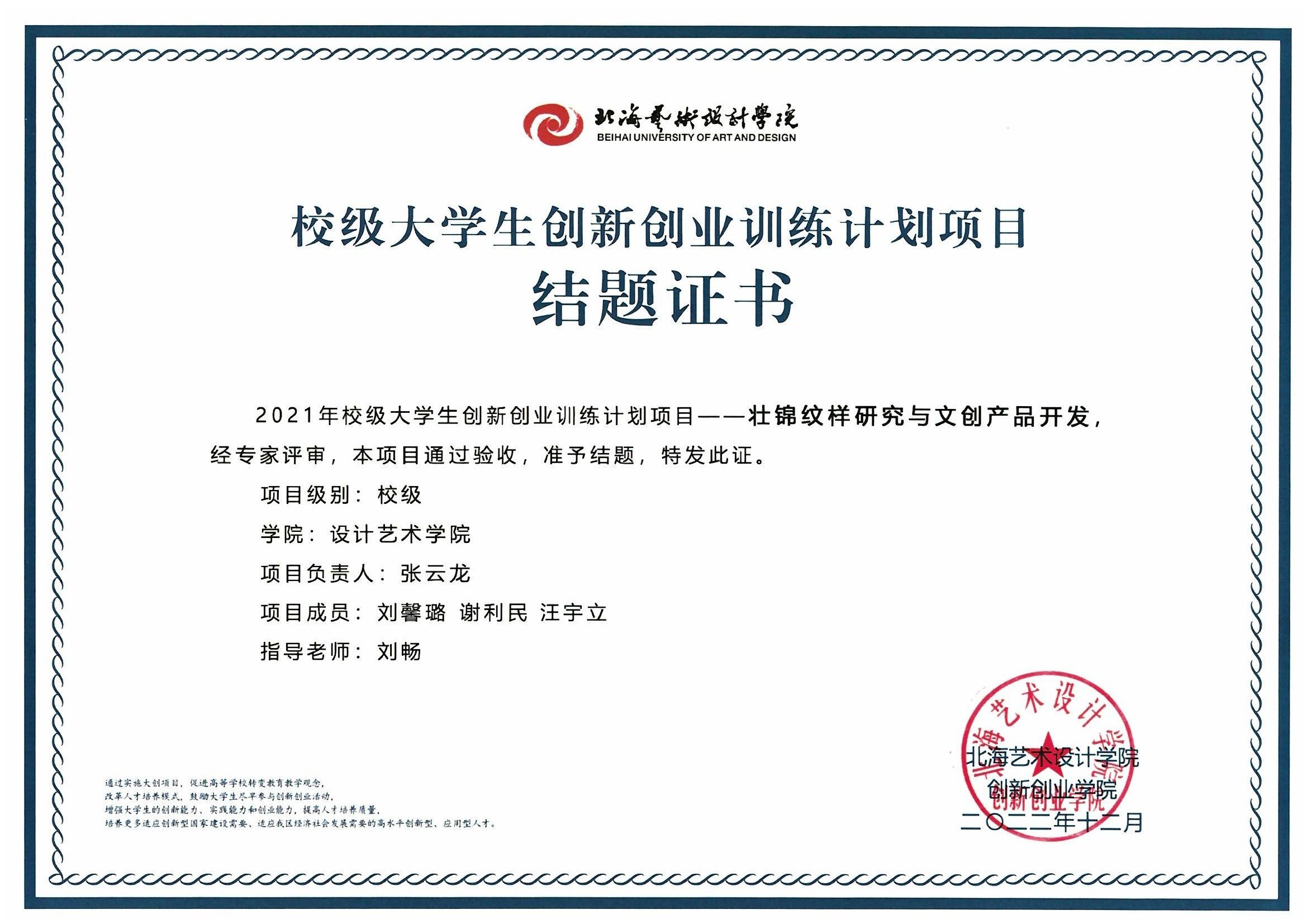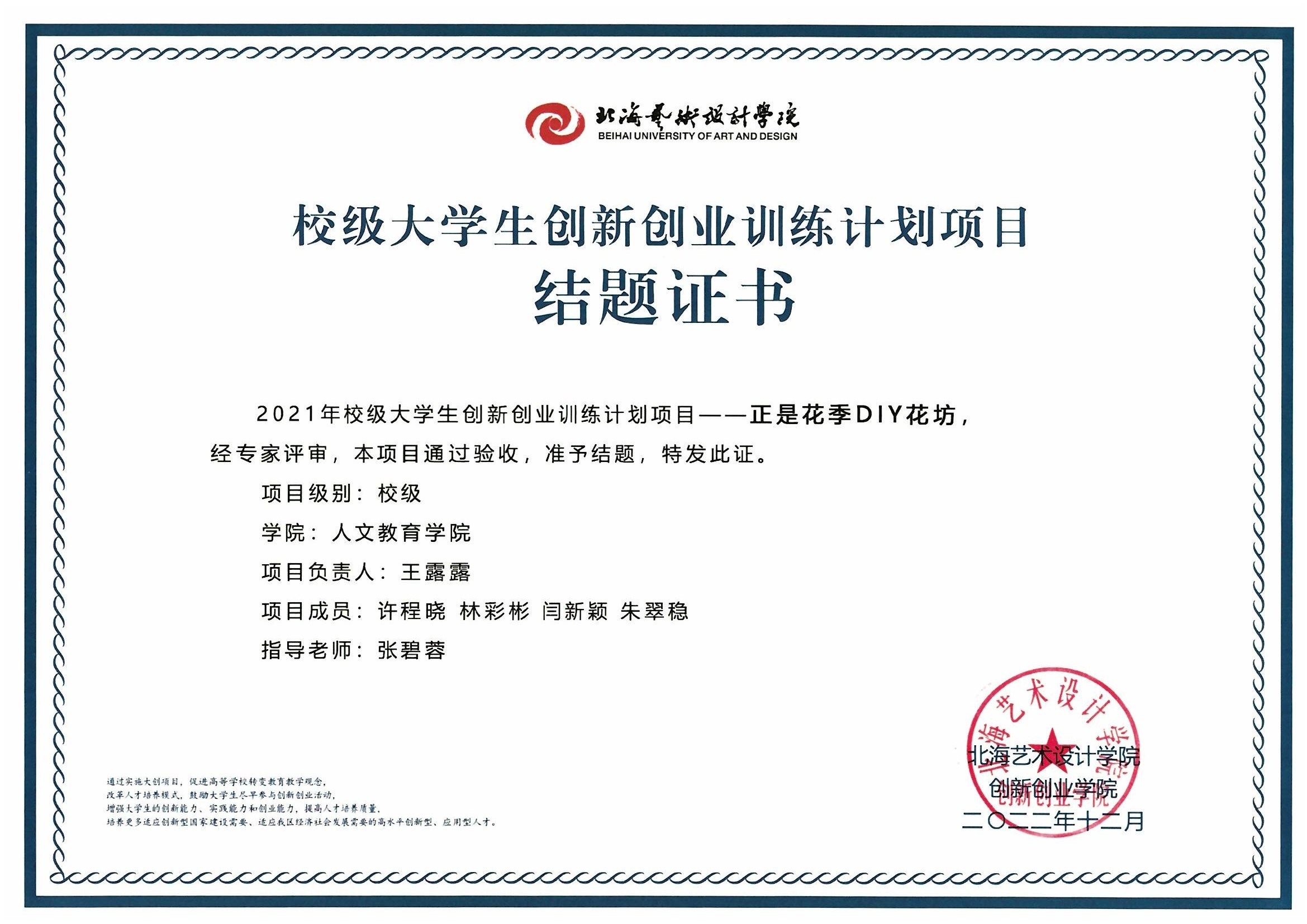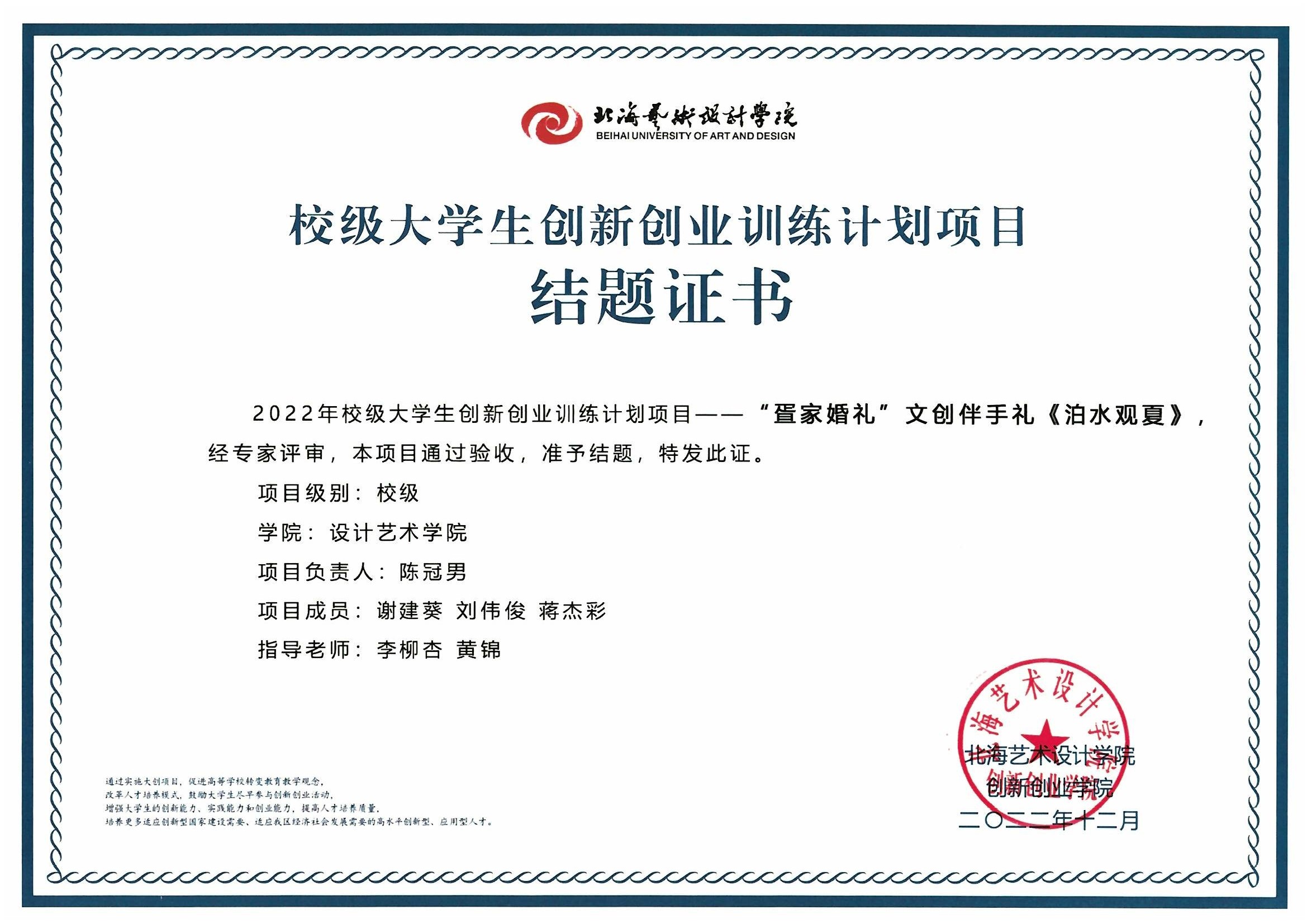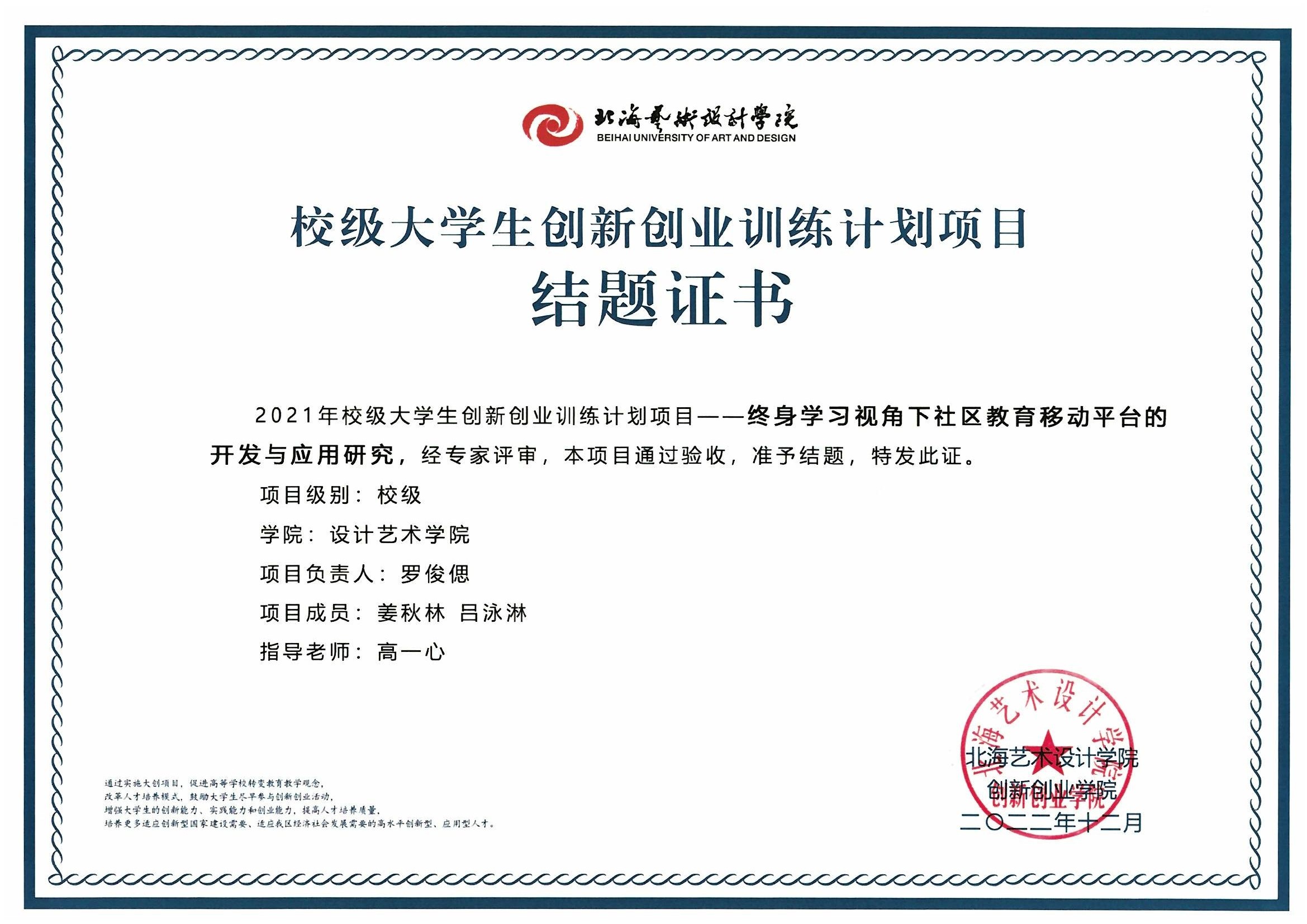 2022年校级大创项目结题证书