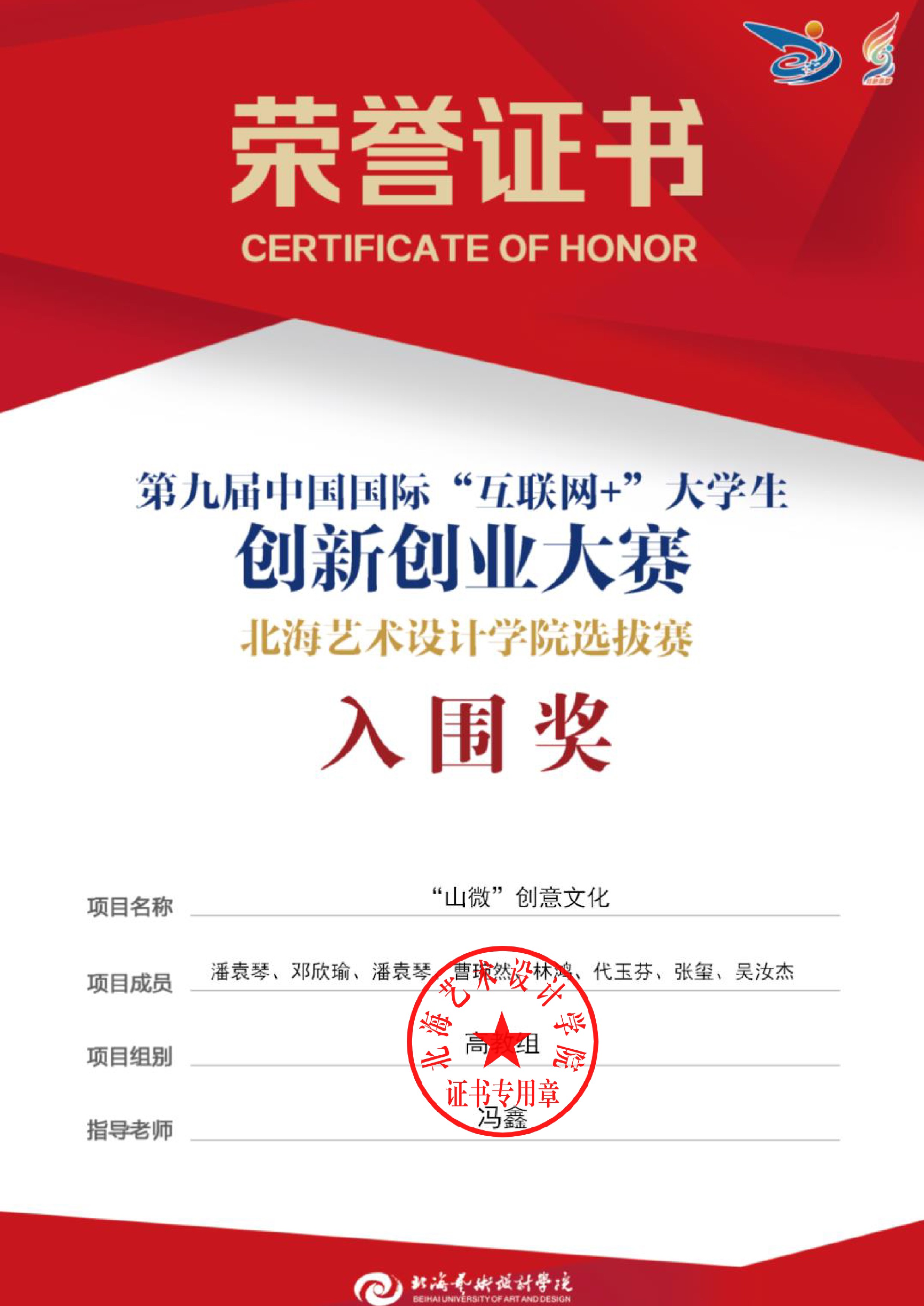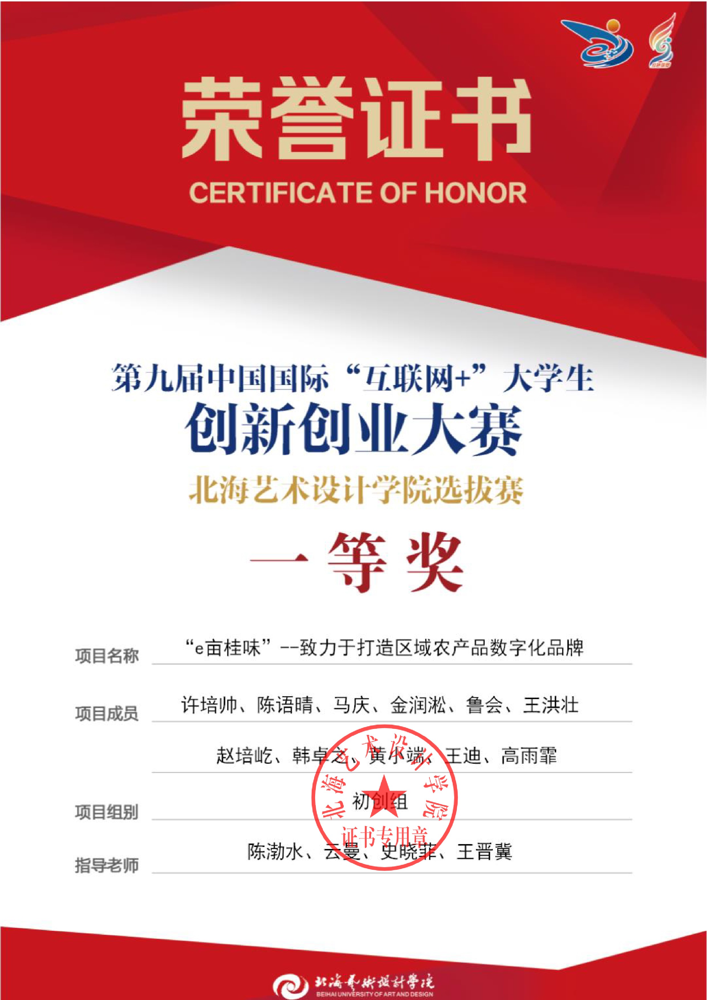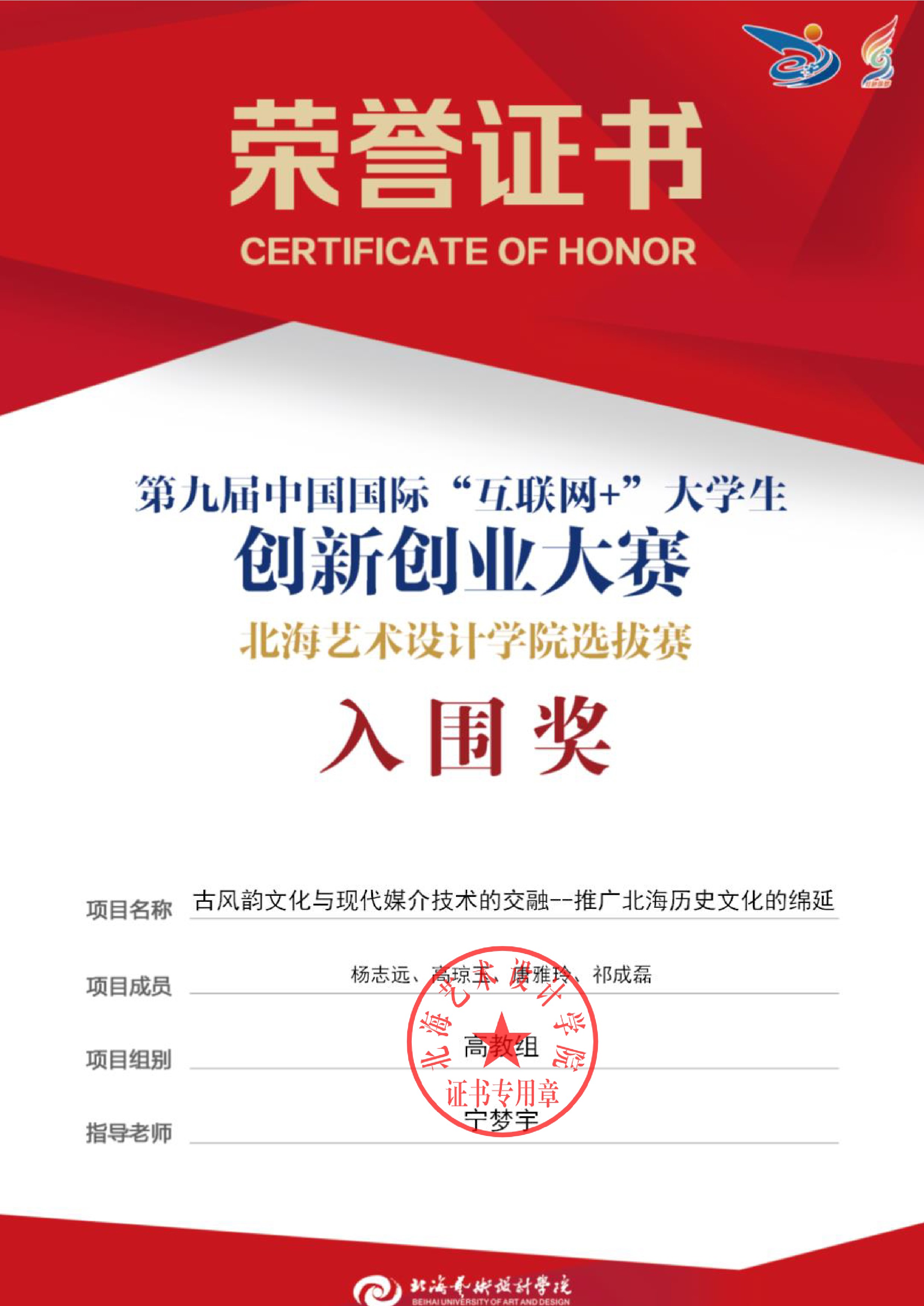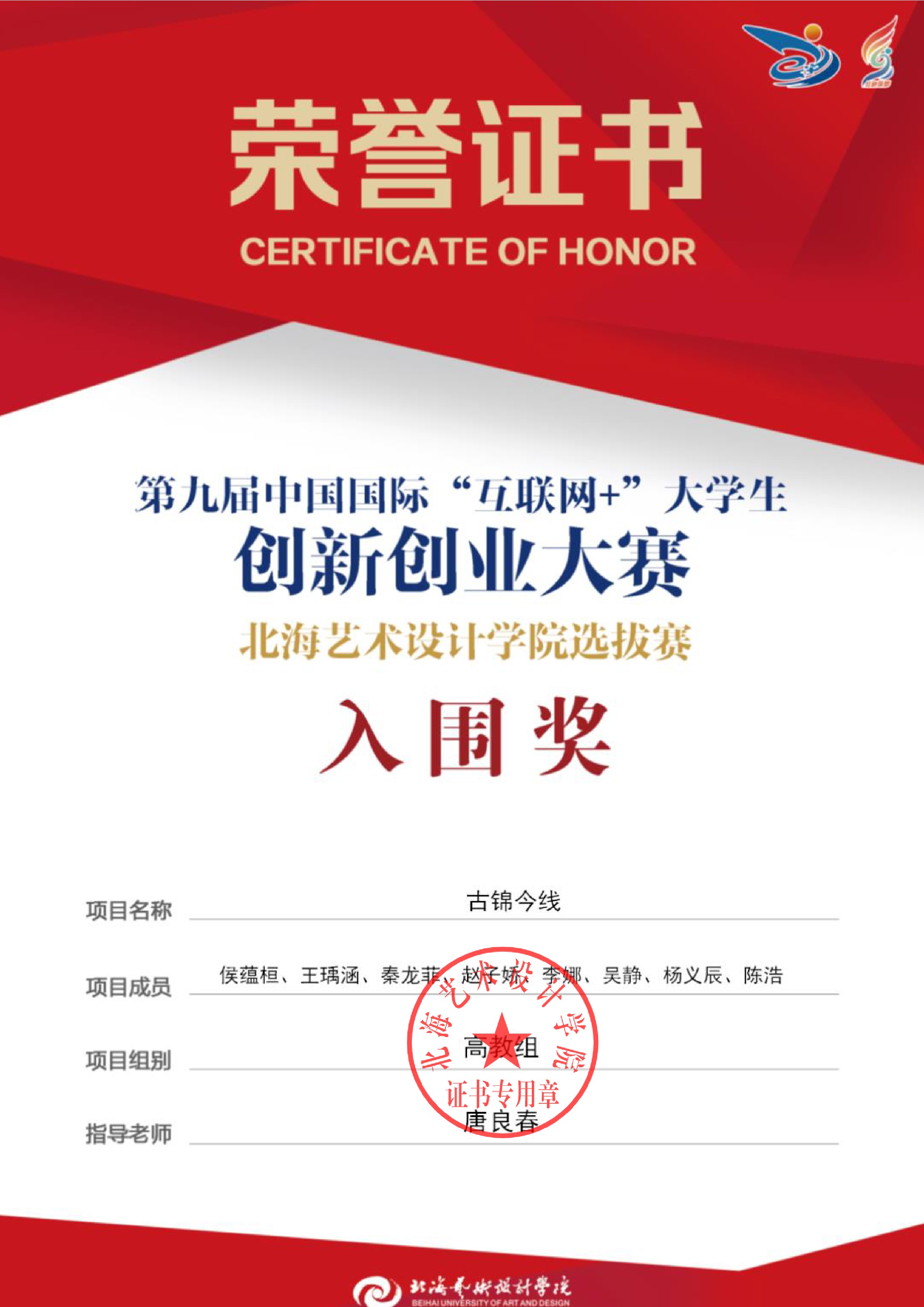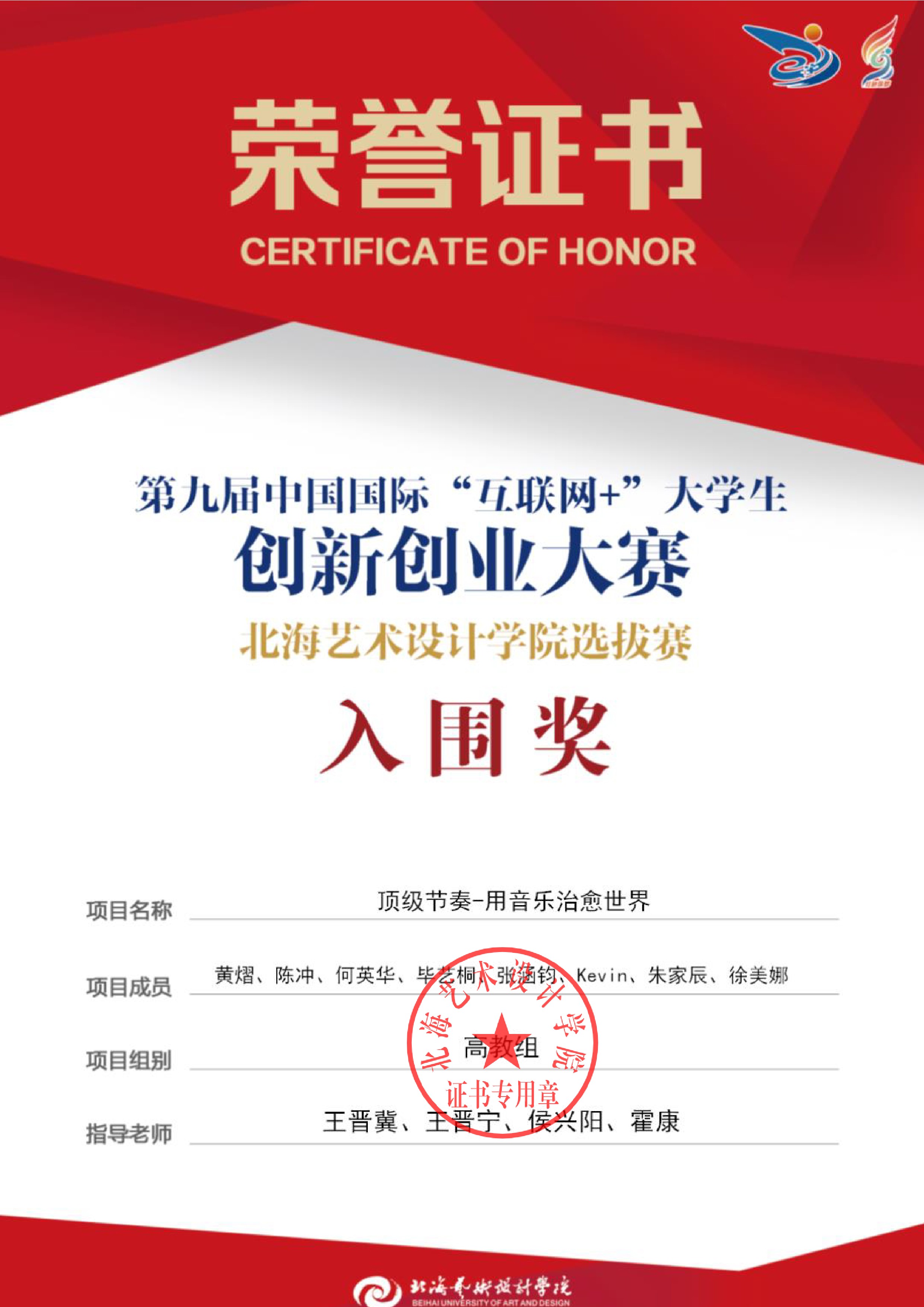 第九届中国国际互联网+大赛校级证书