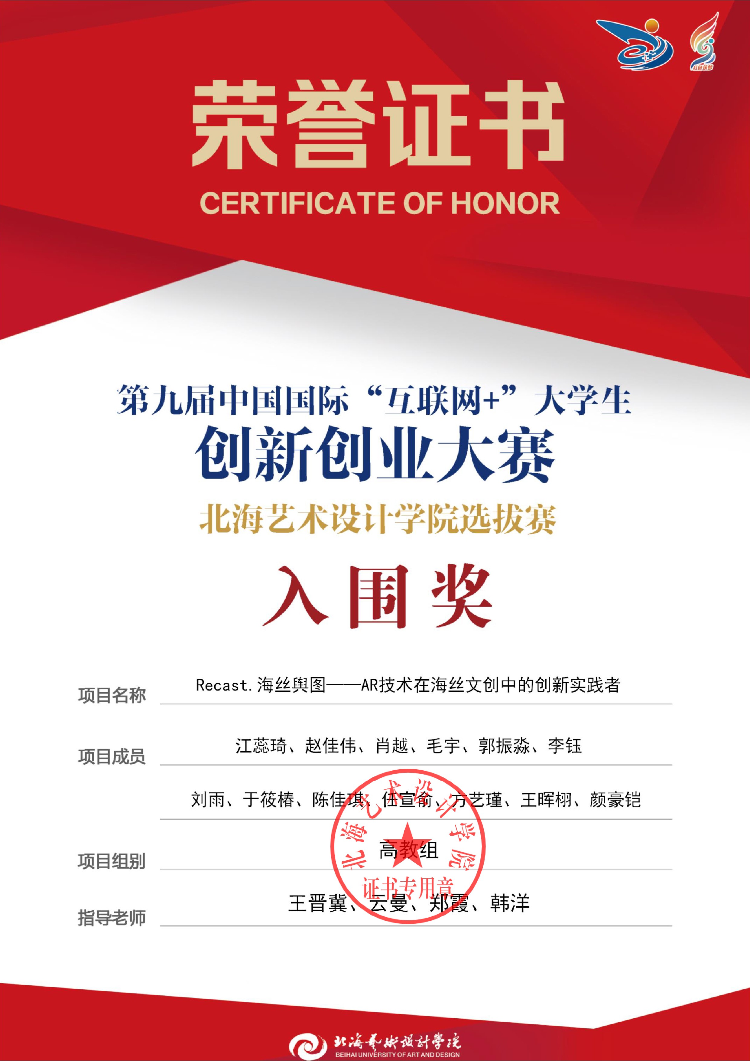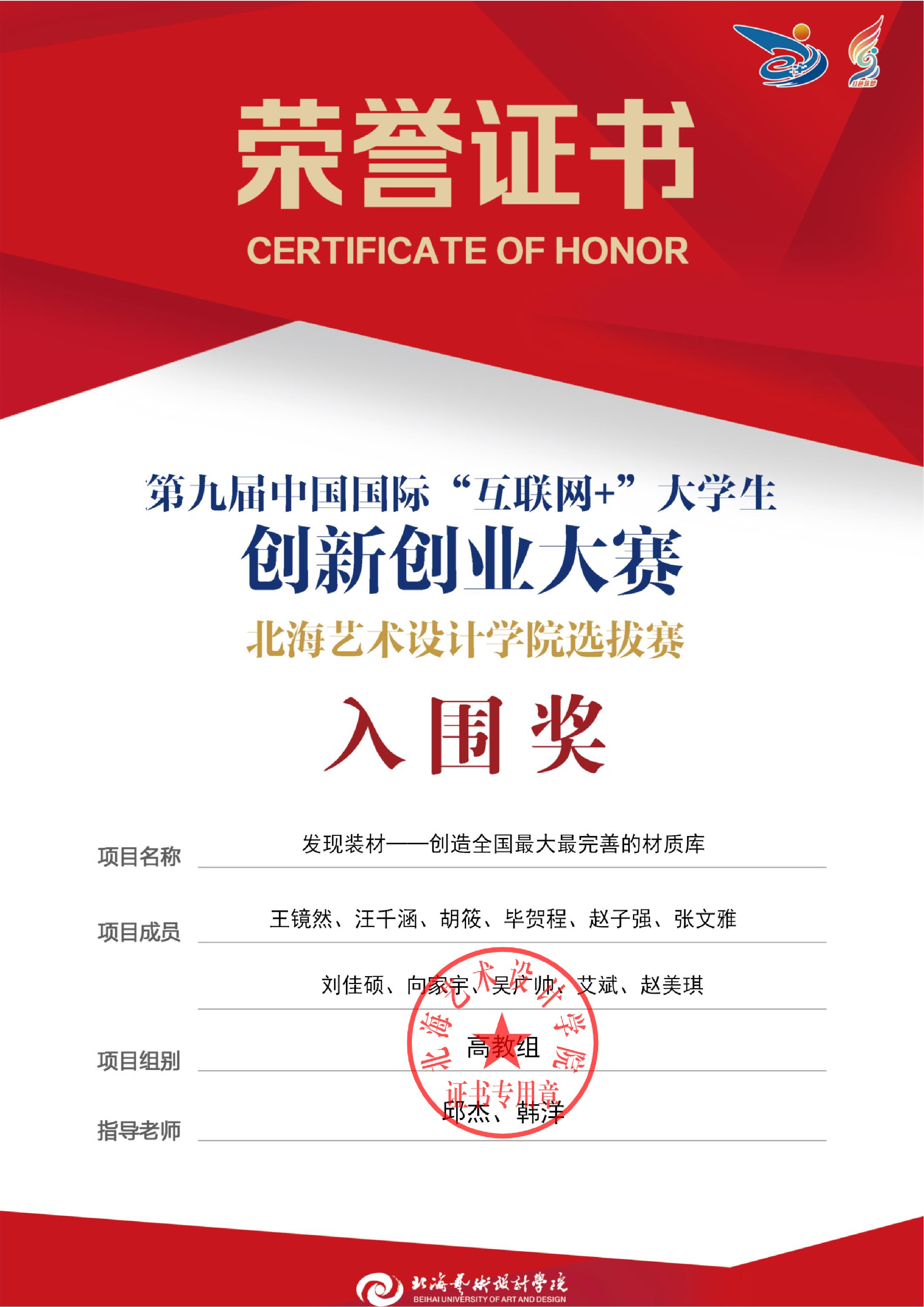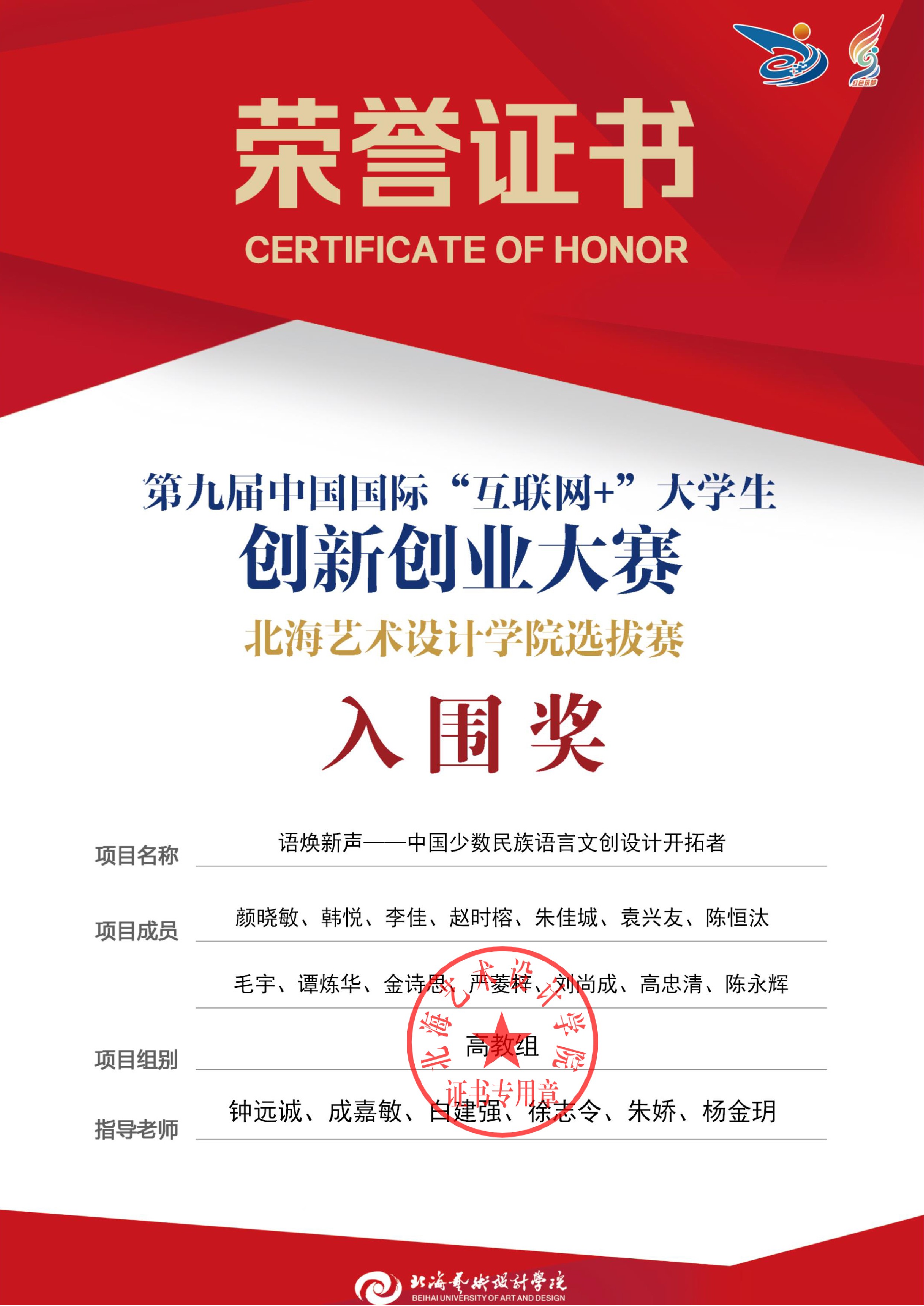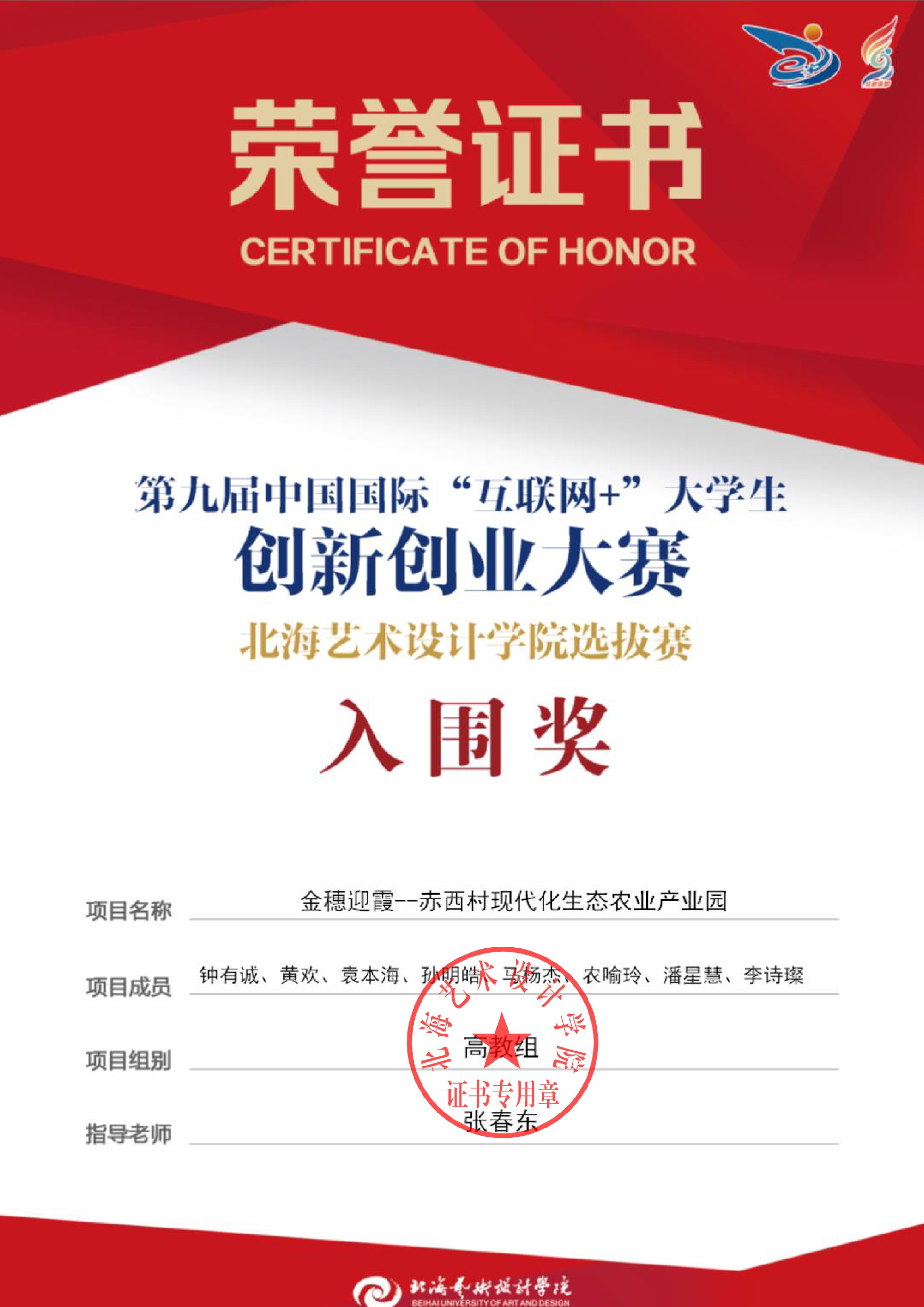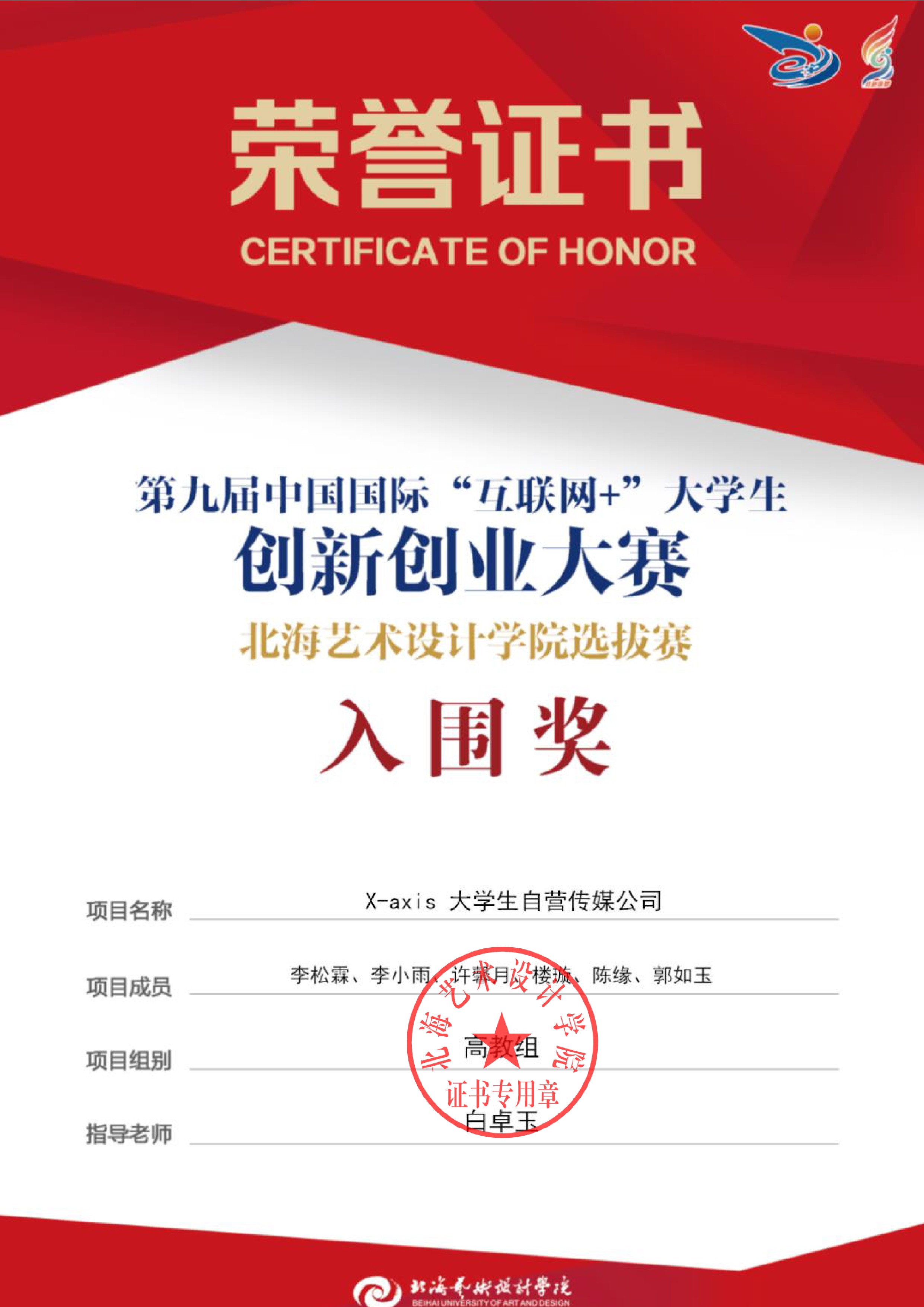 第九届中国国际互联网+大赛校级证书