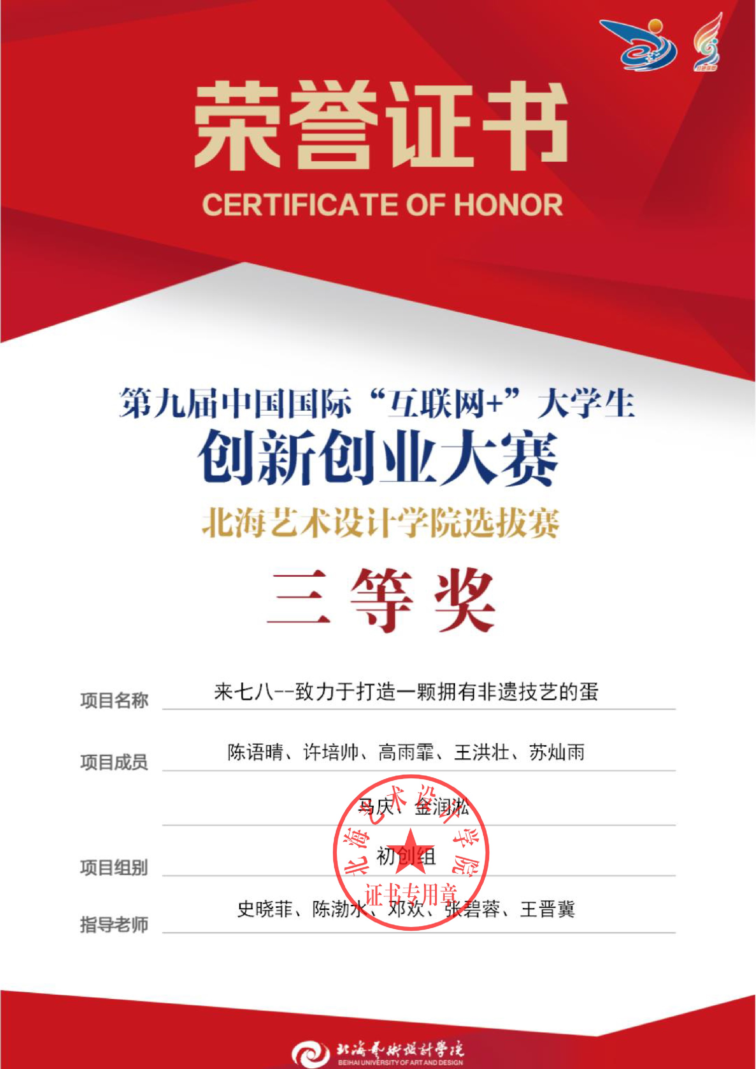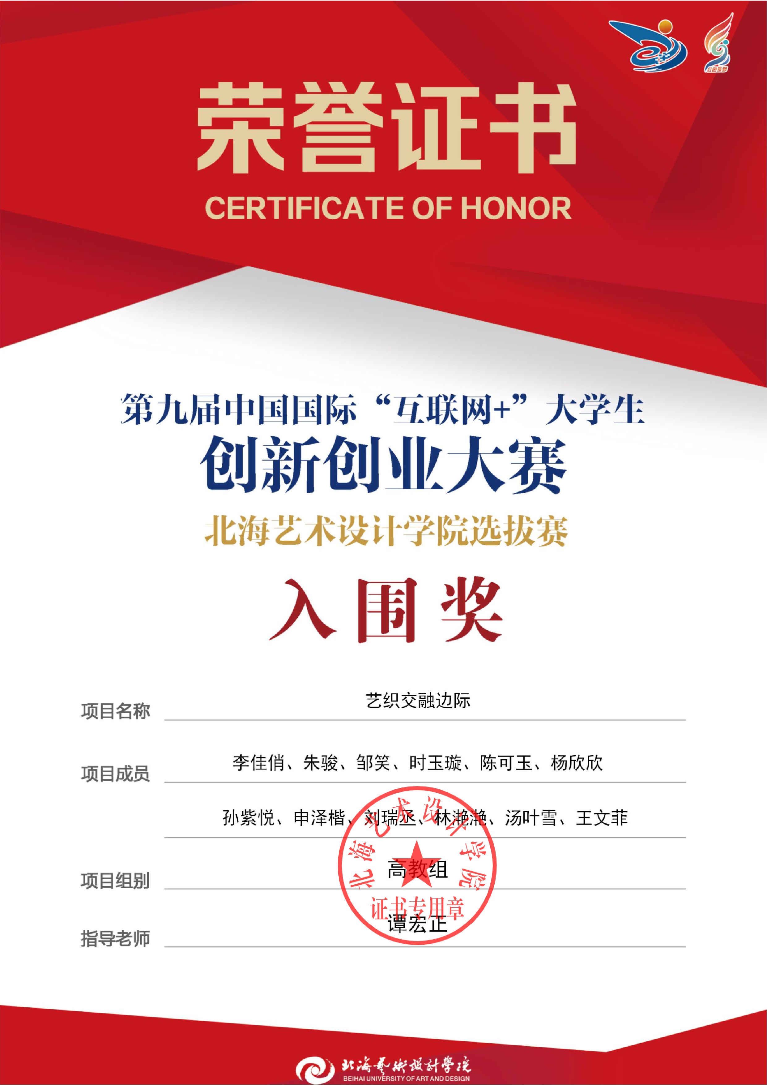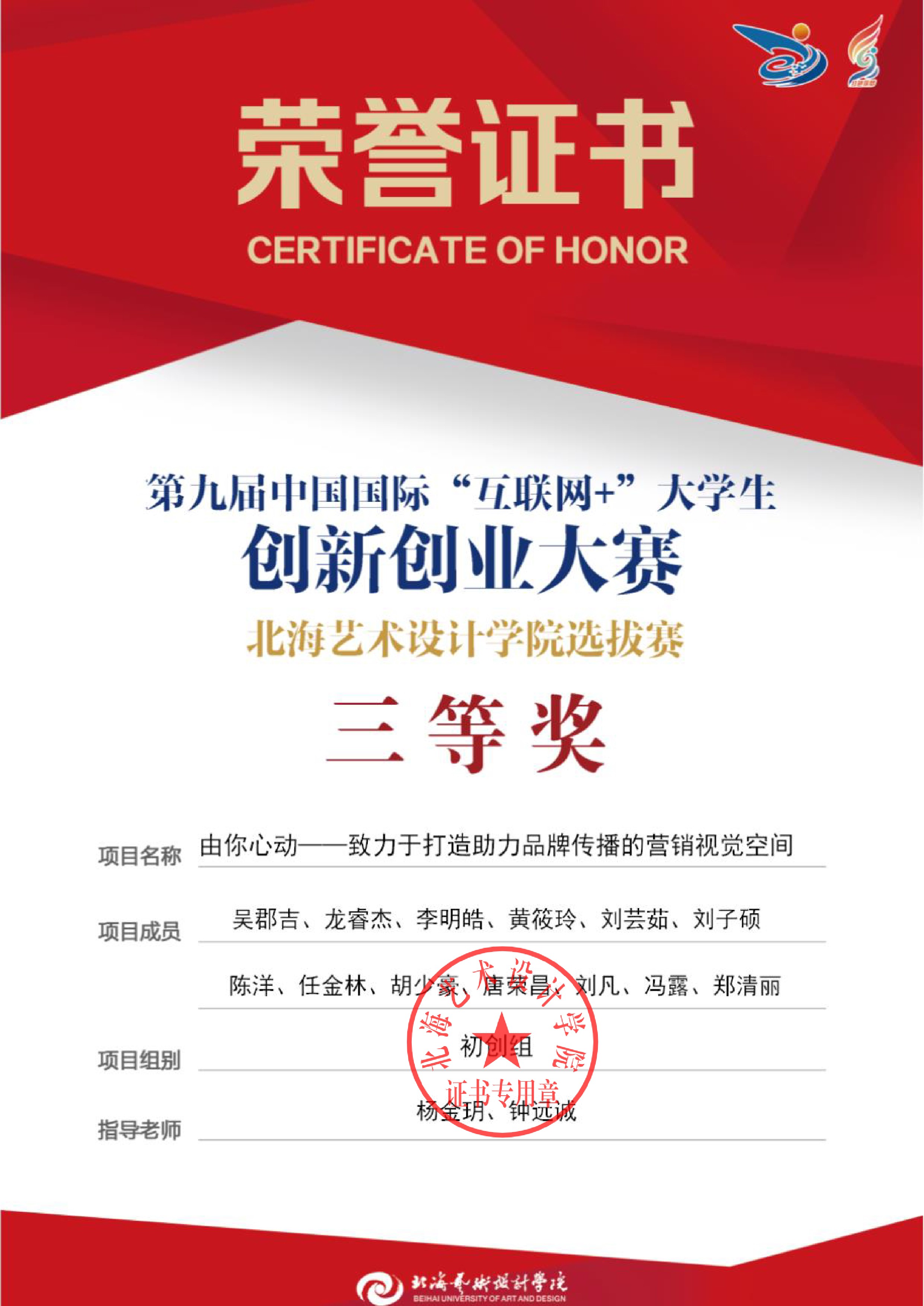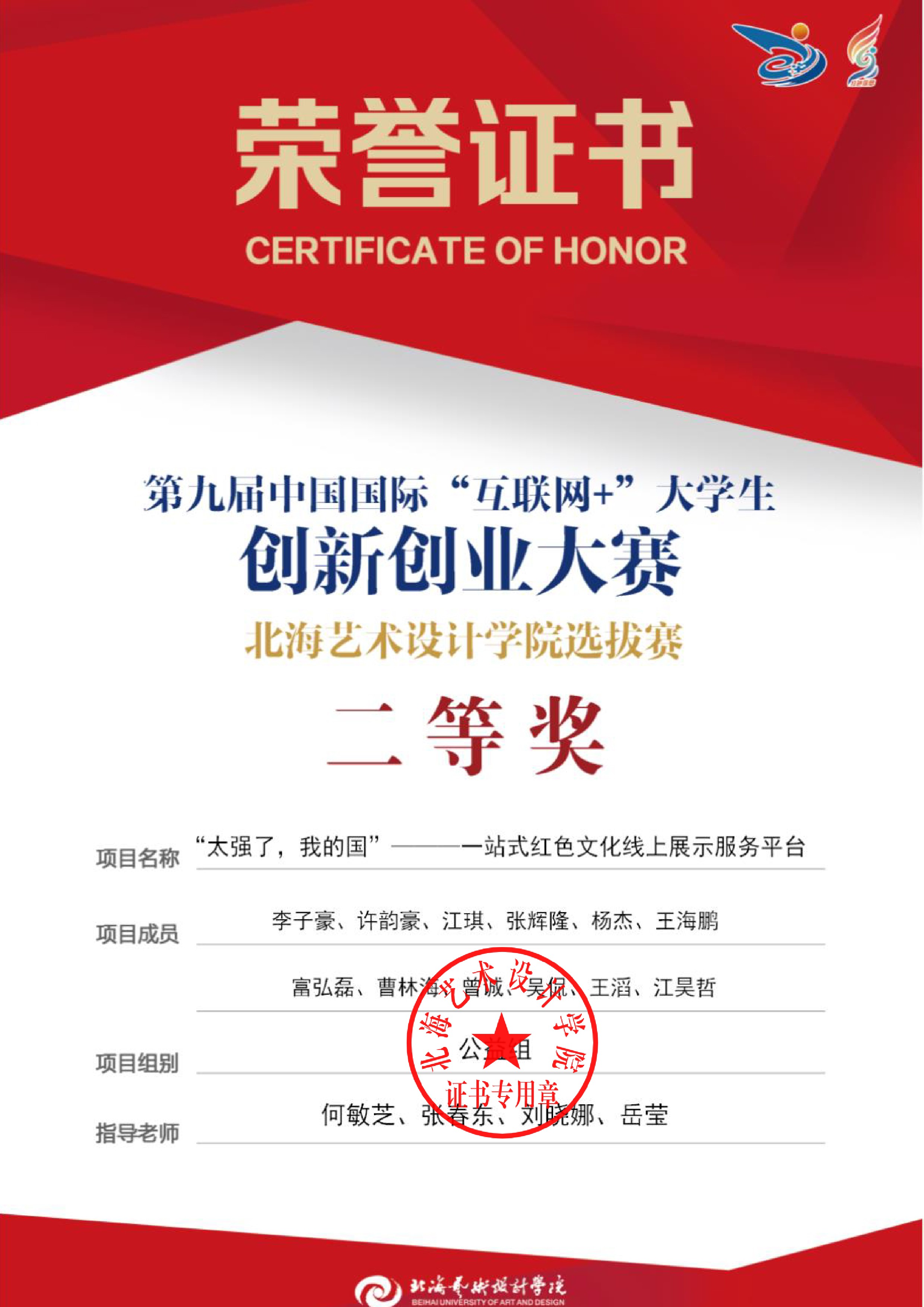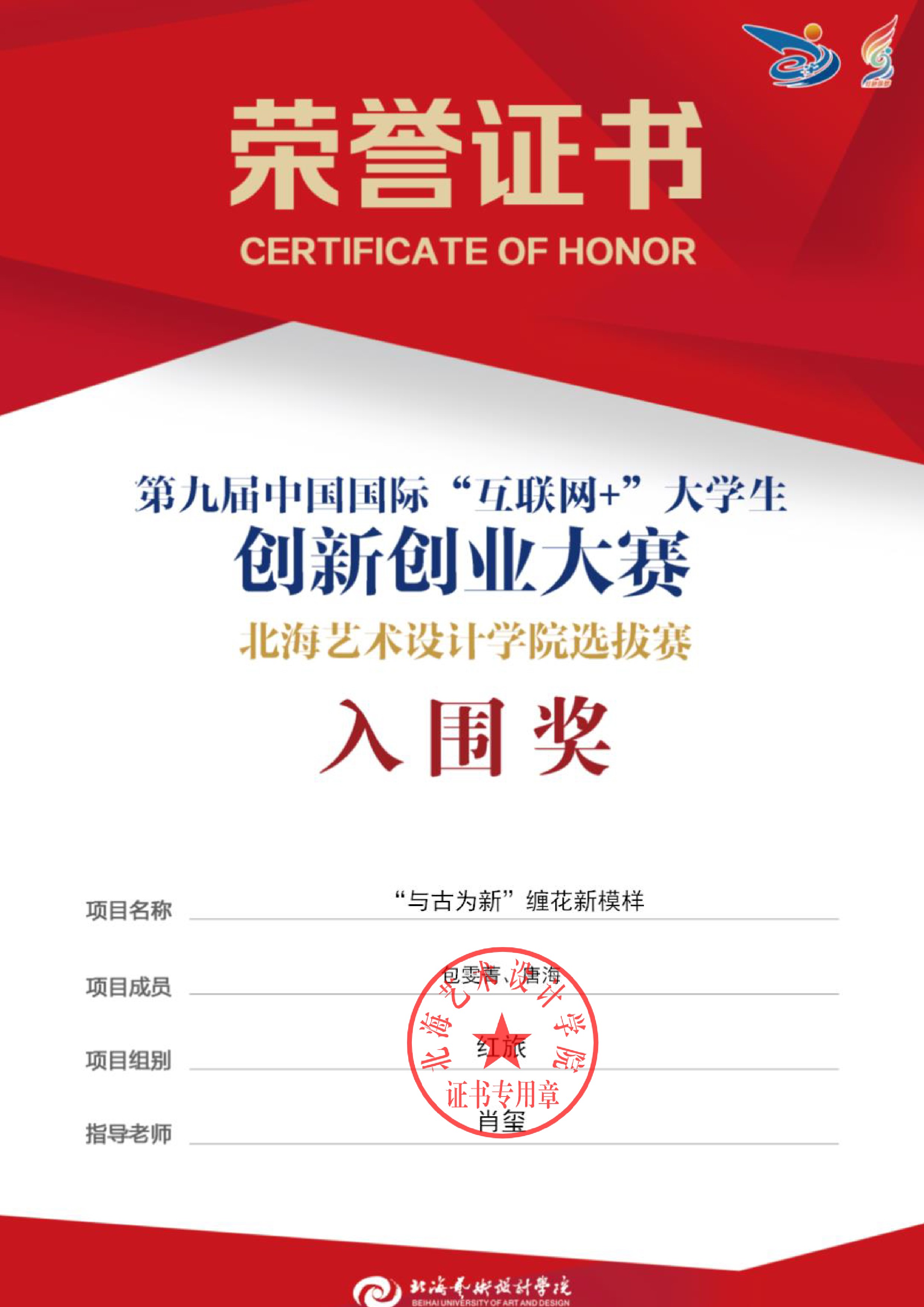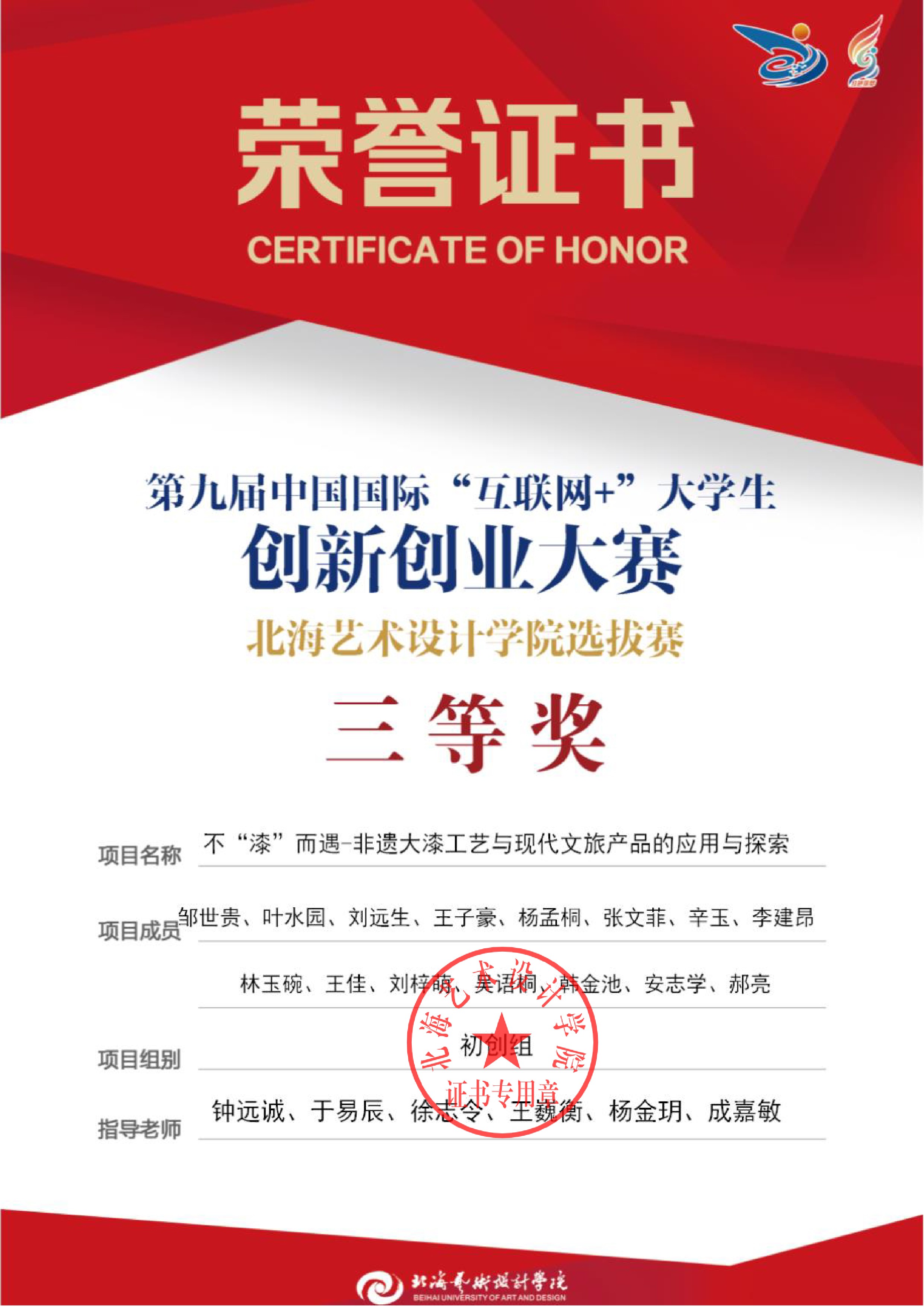 第九届中国国际互联网+大赛校级证书