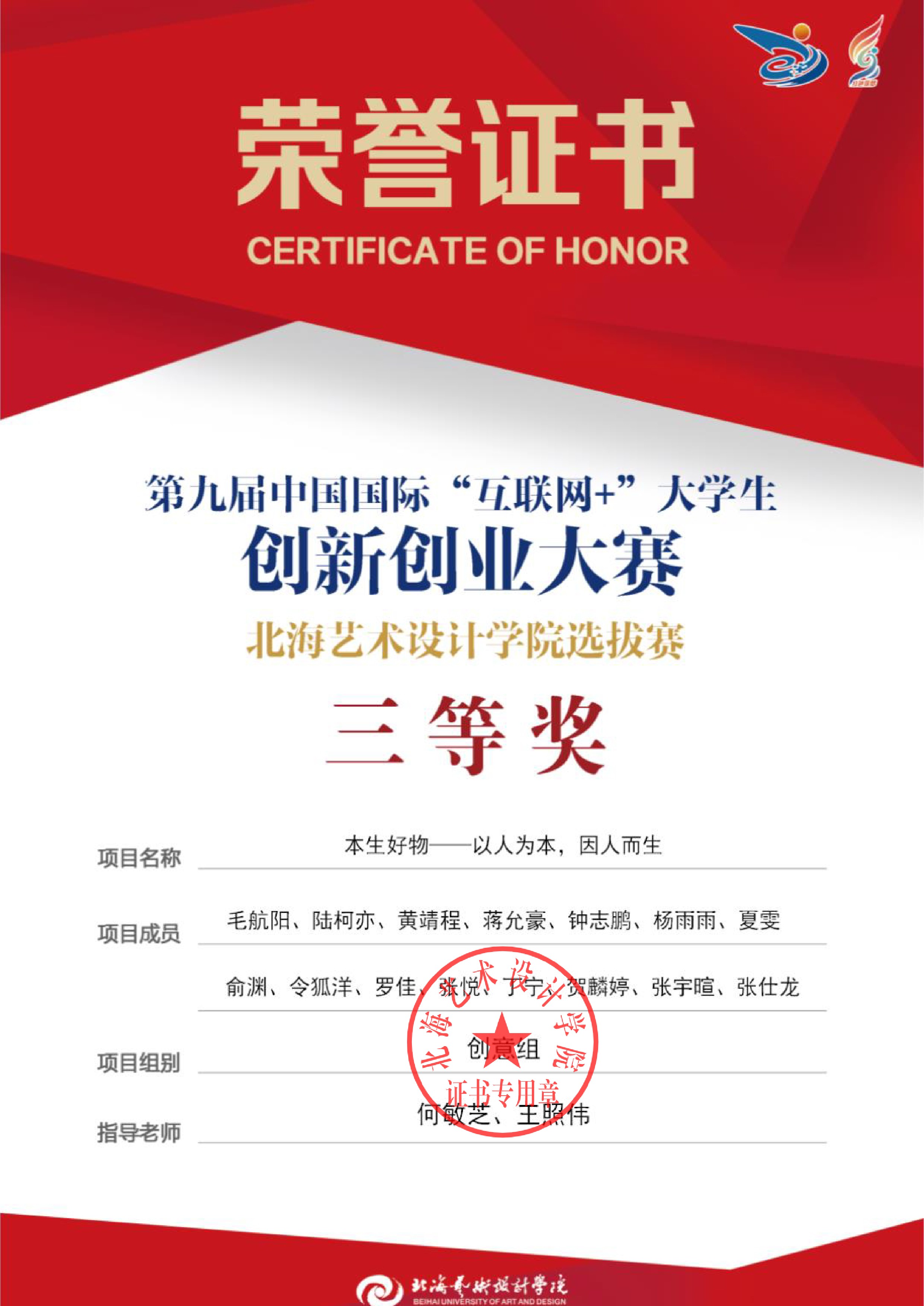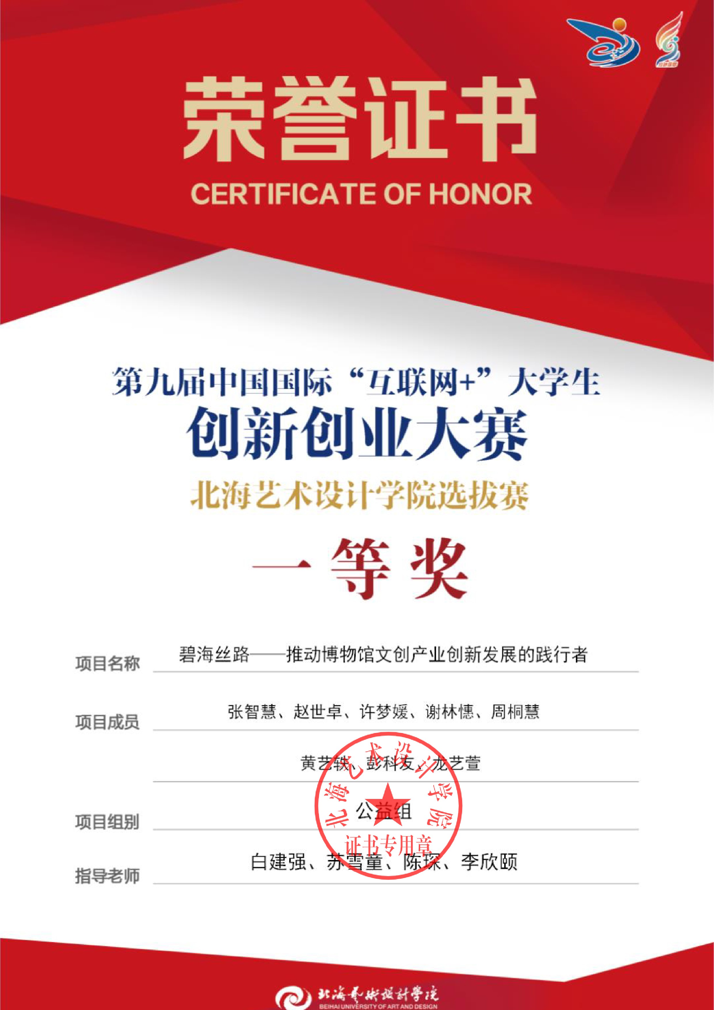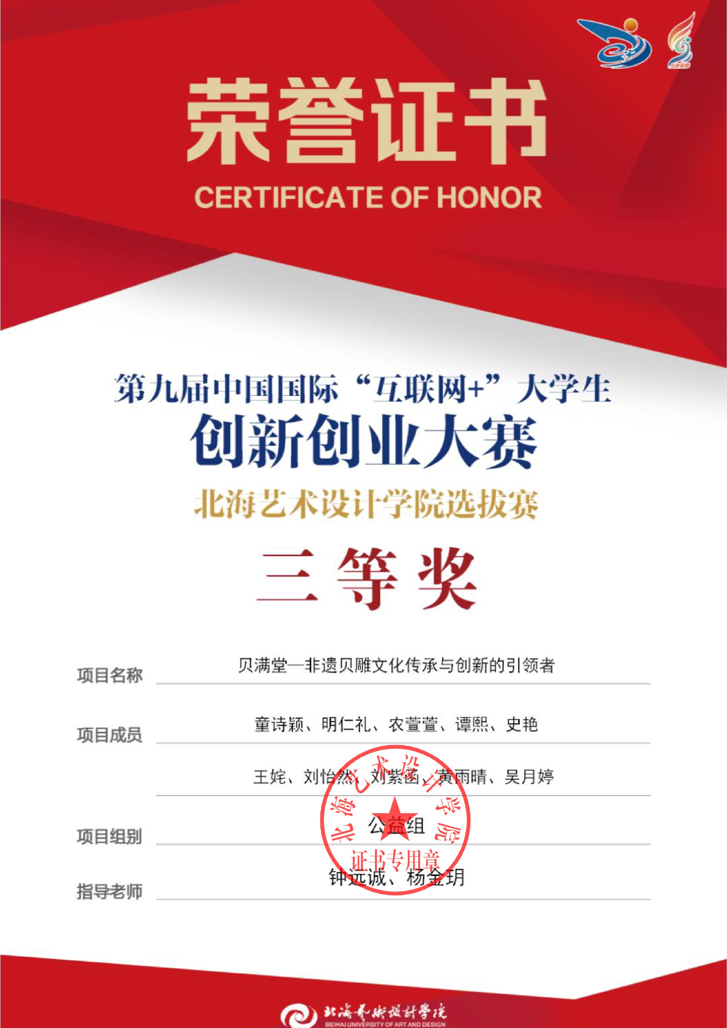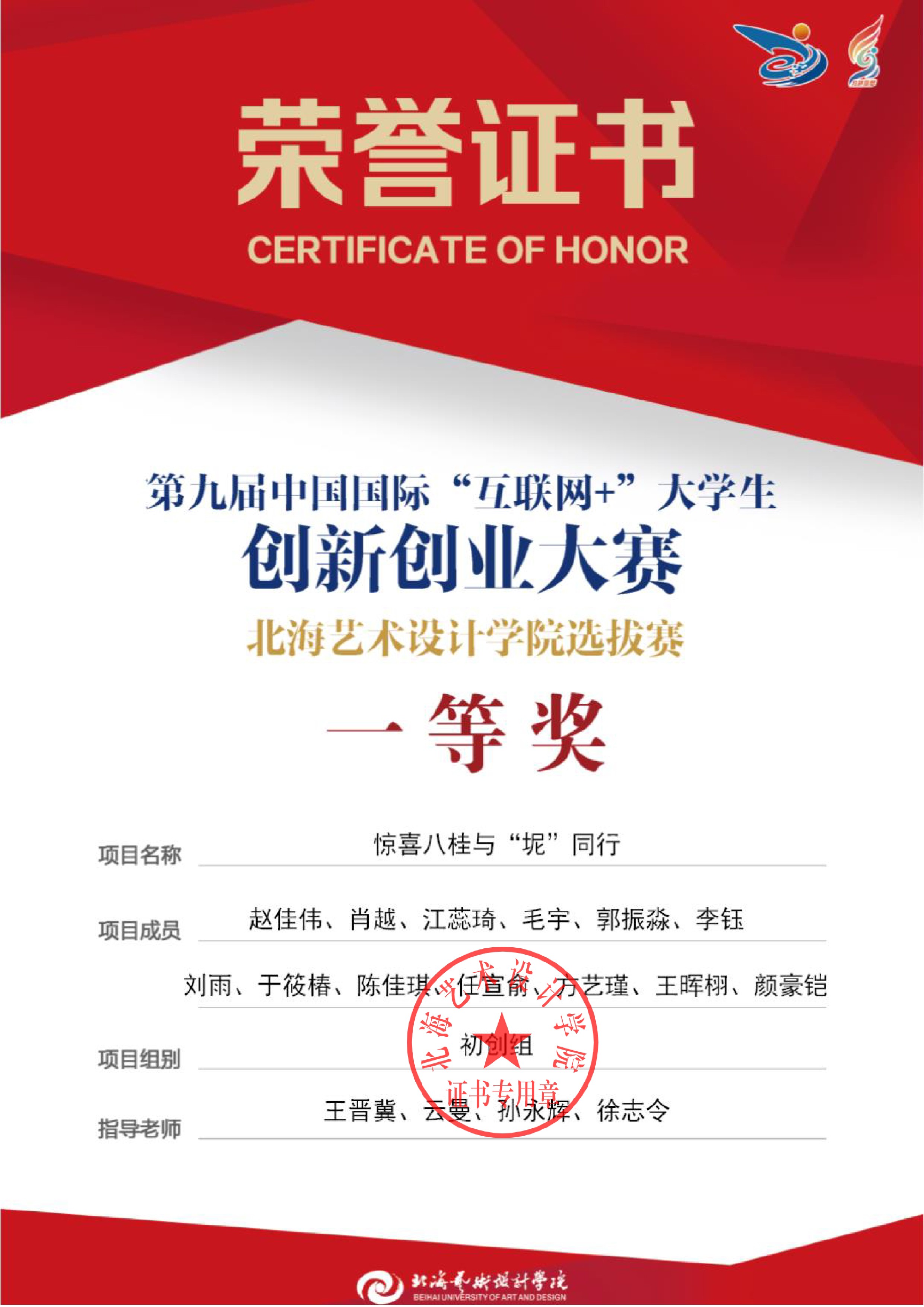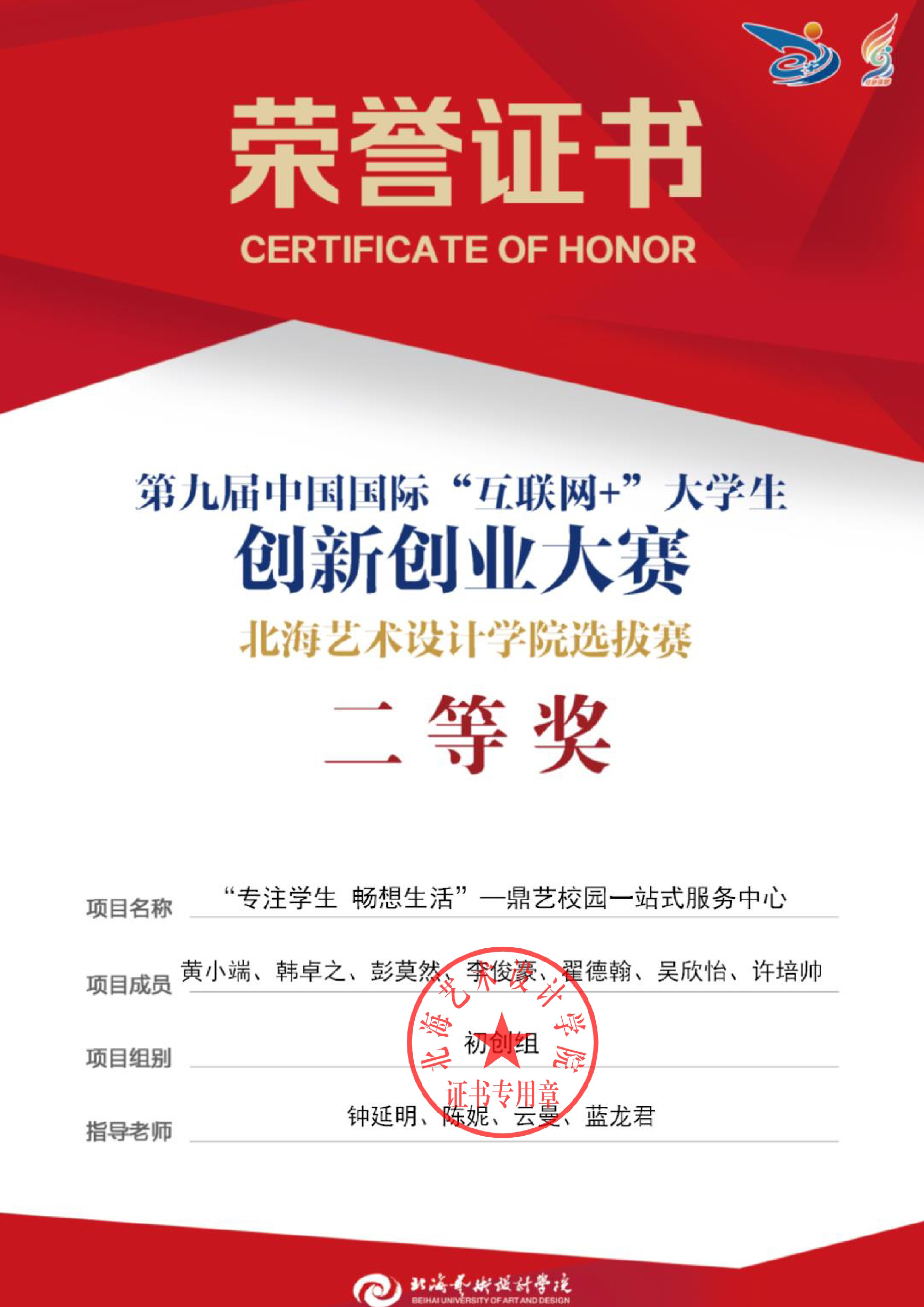 第九届中国国际互联网+大赛校级证书