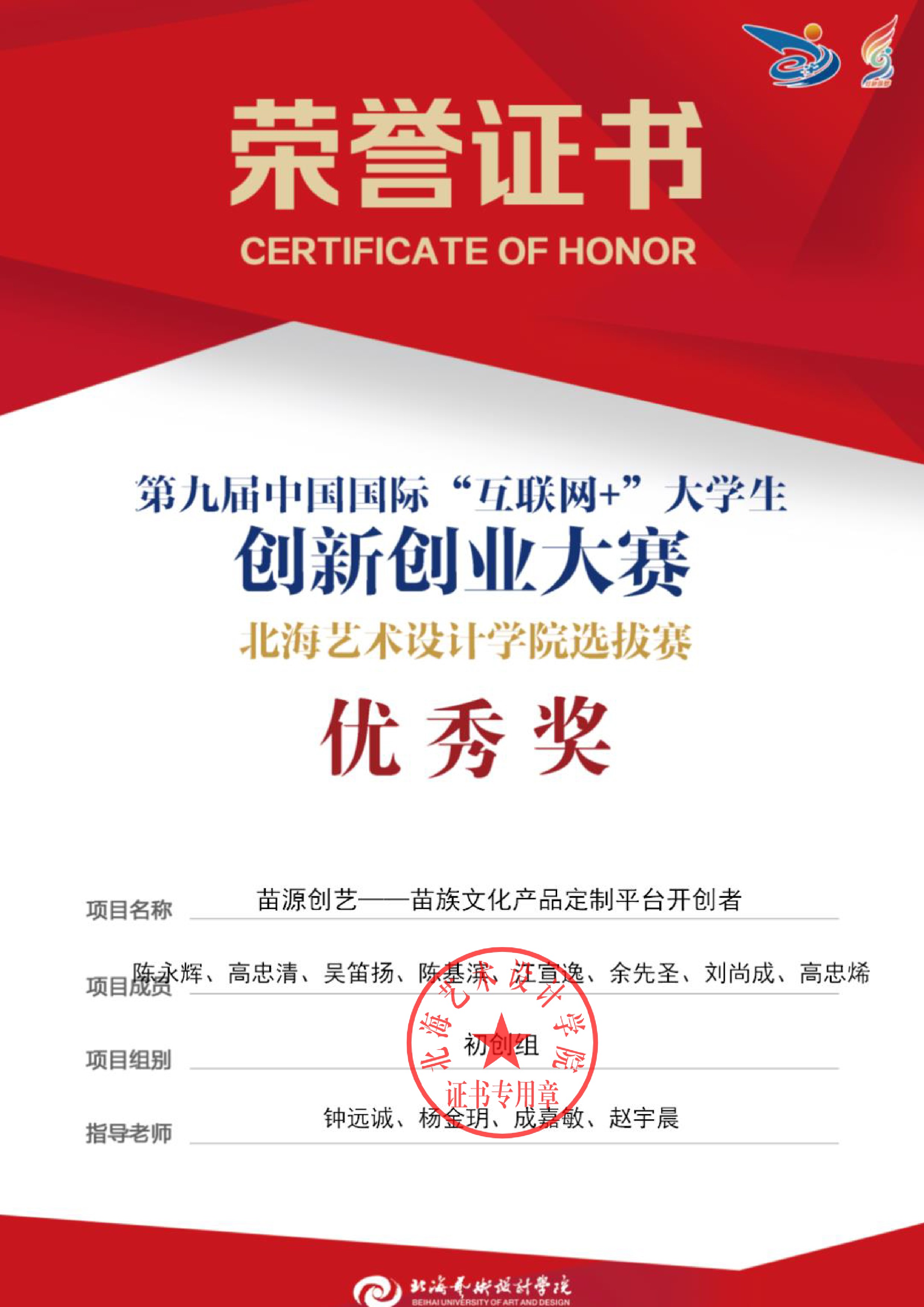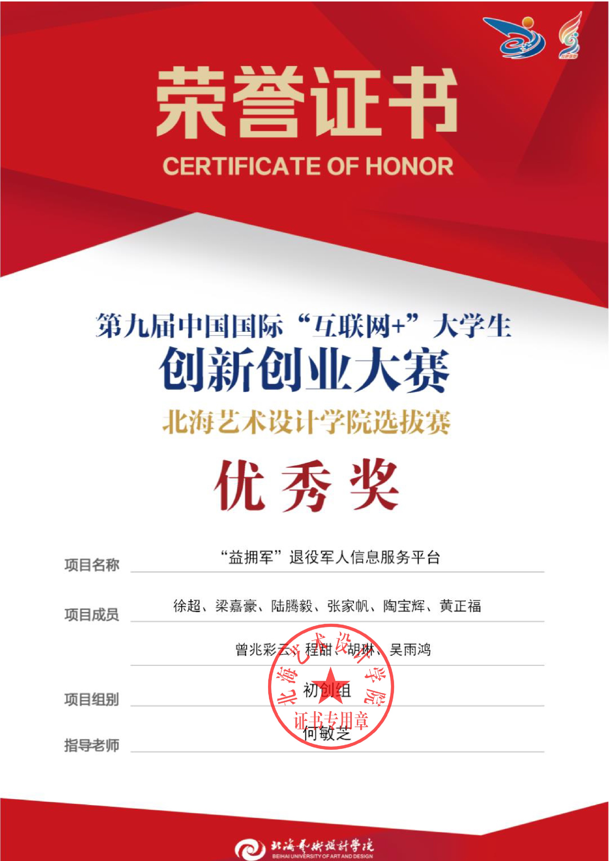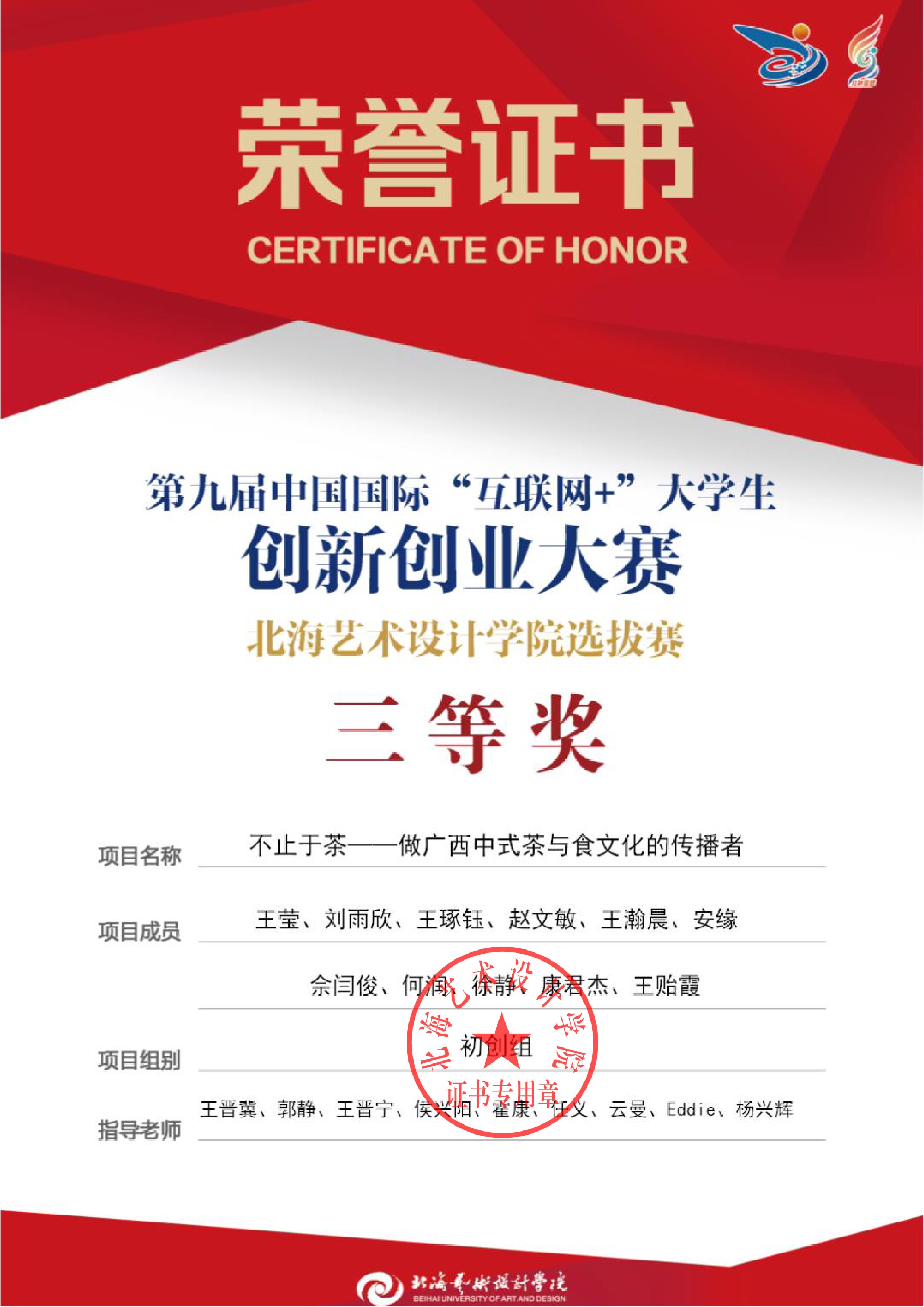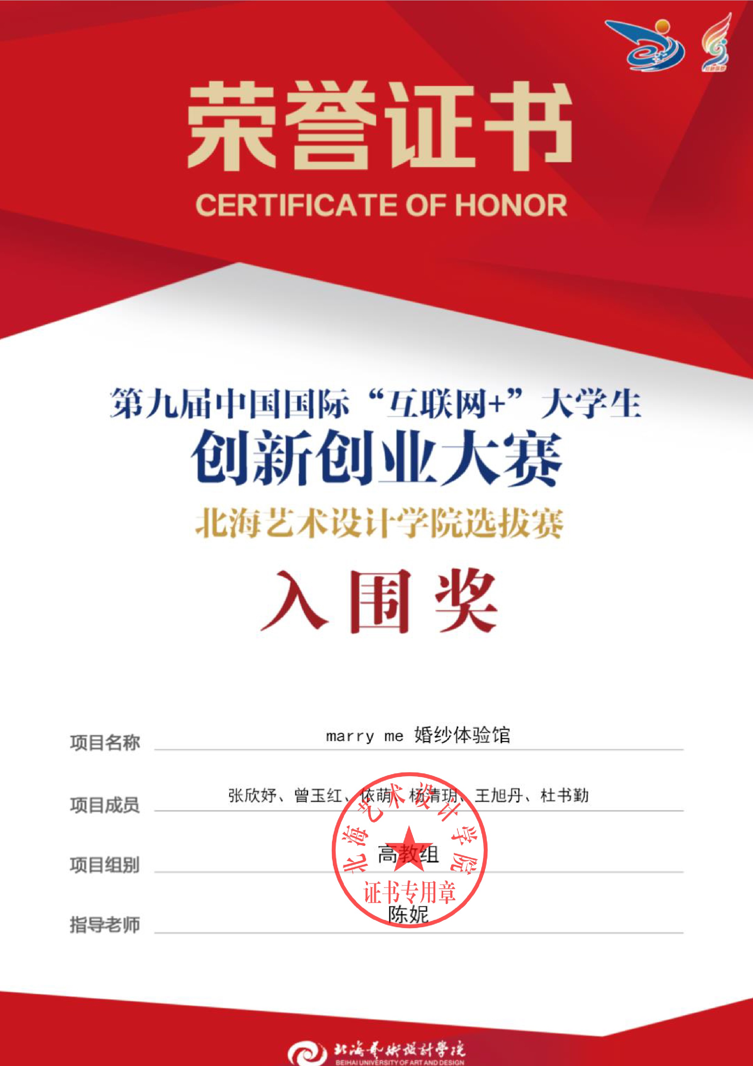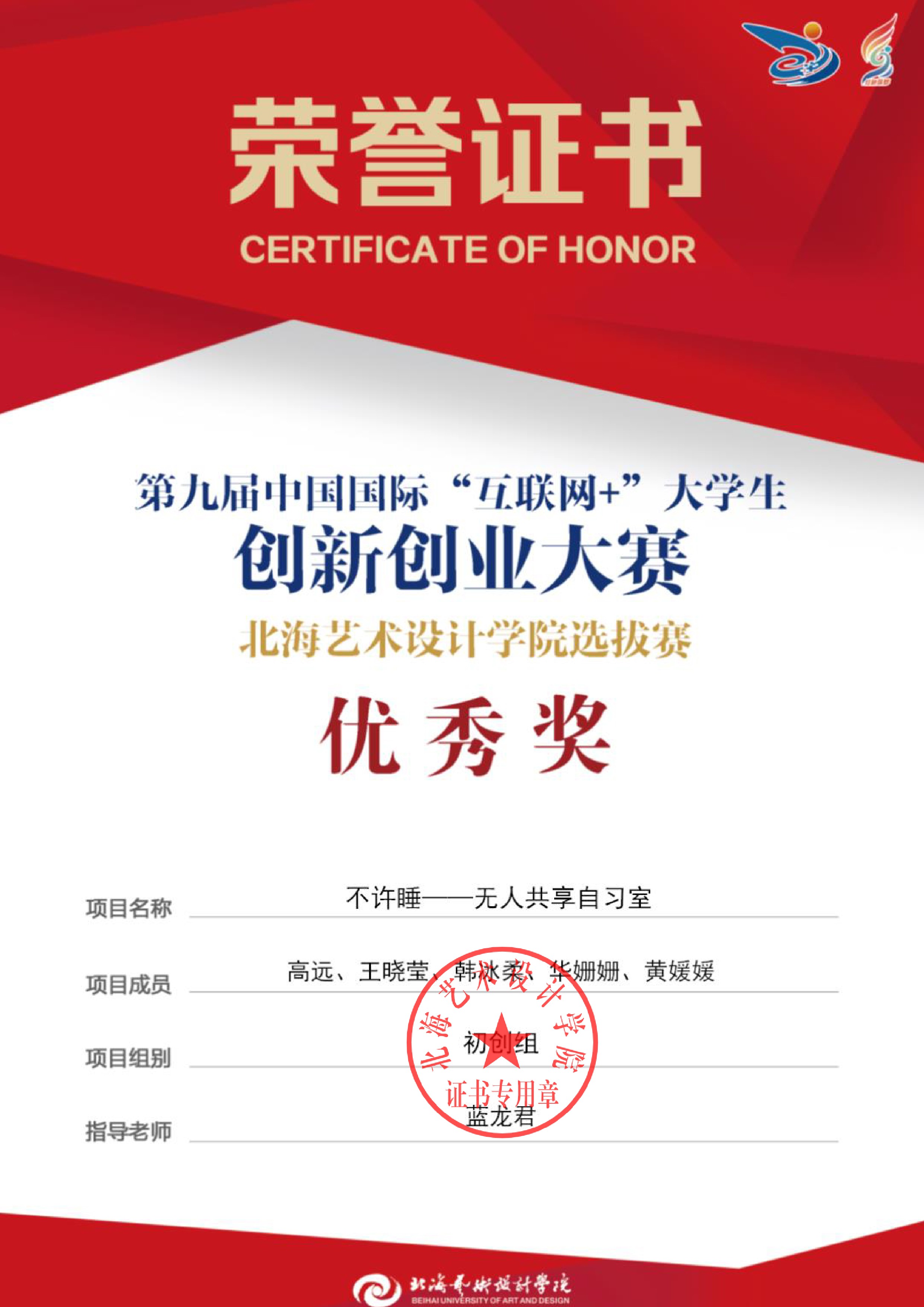 第九届中国国际互联网+大赛校级证书