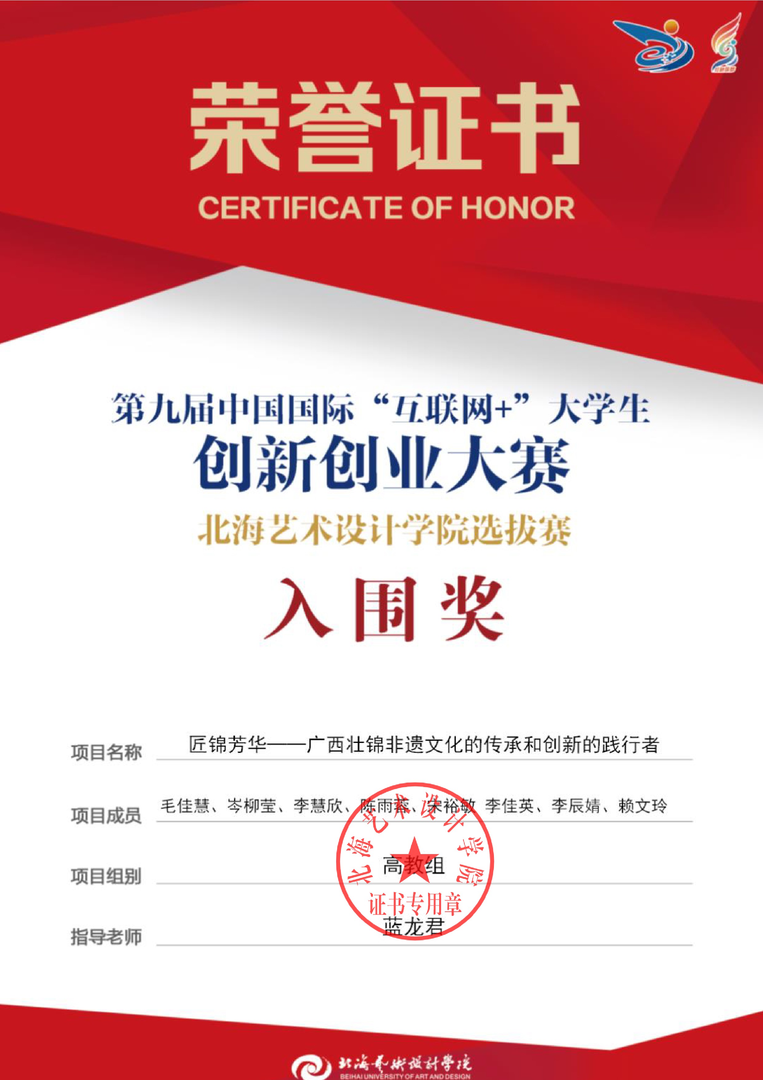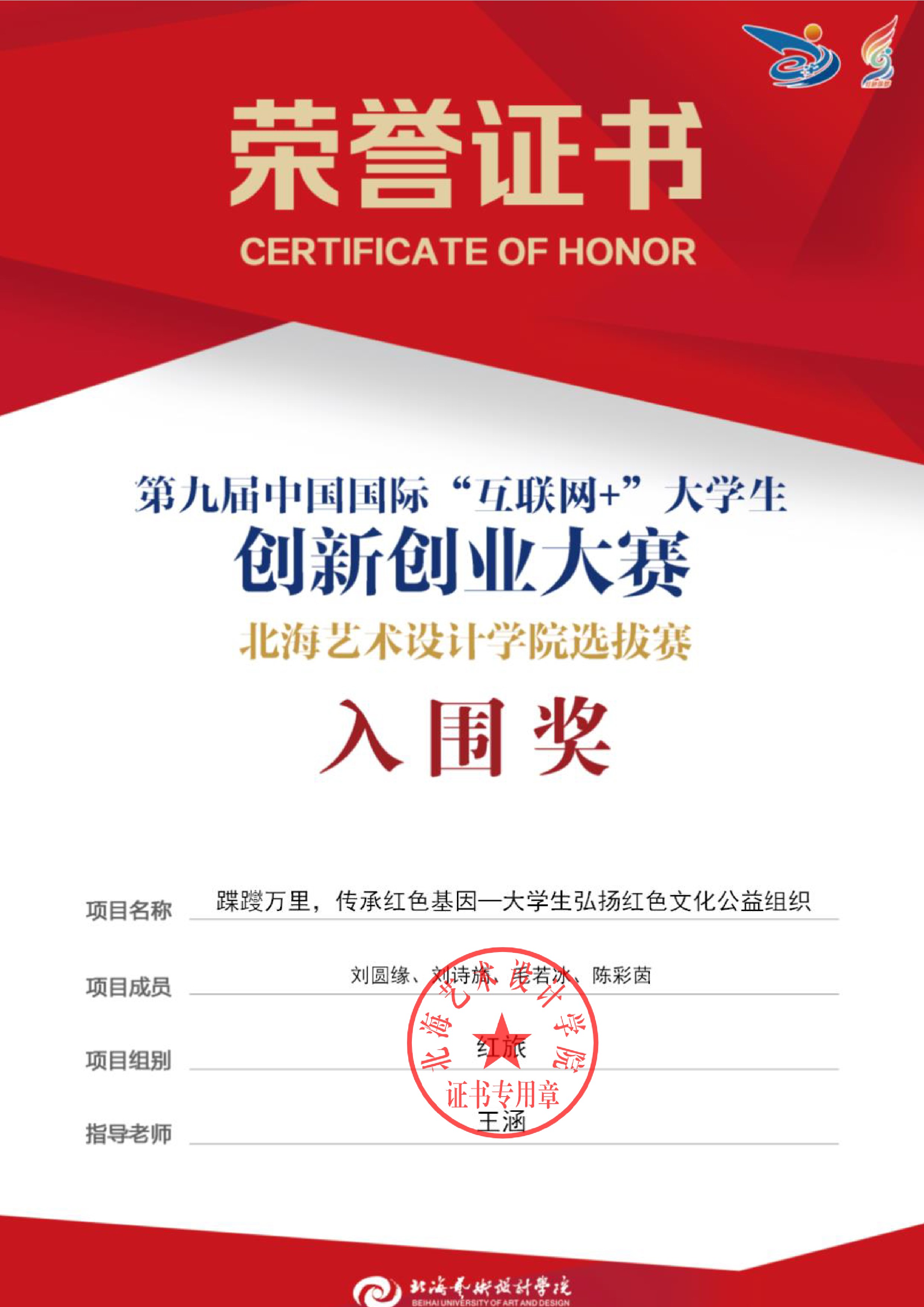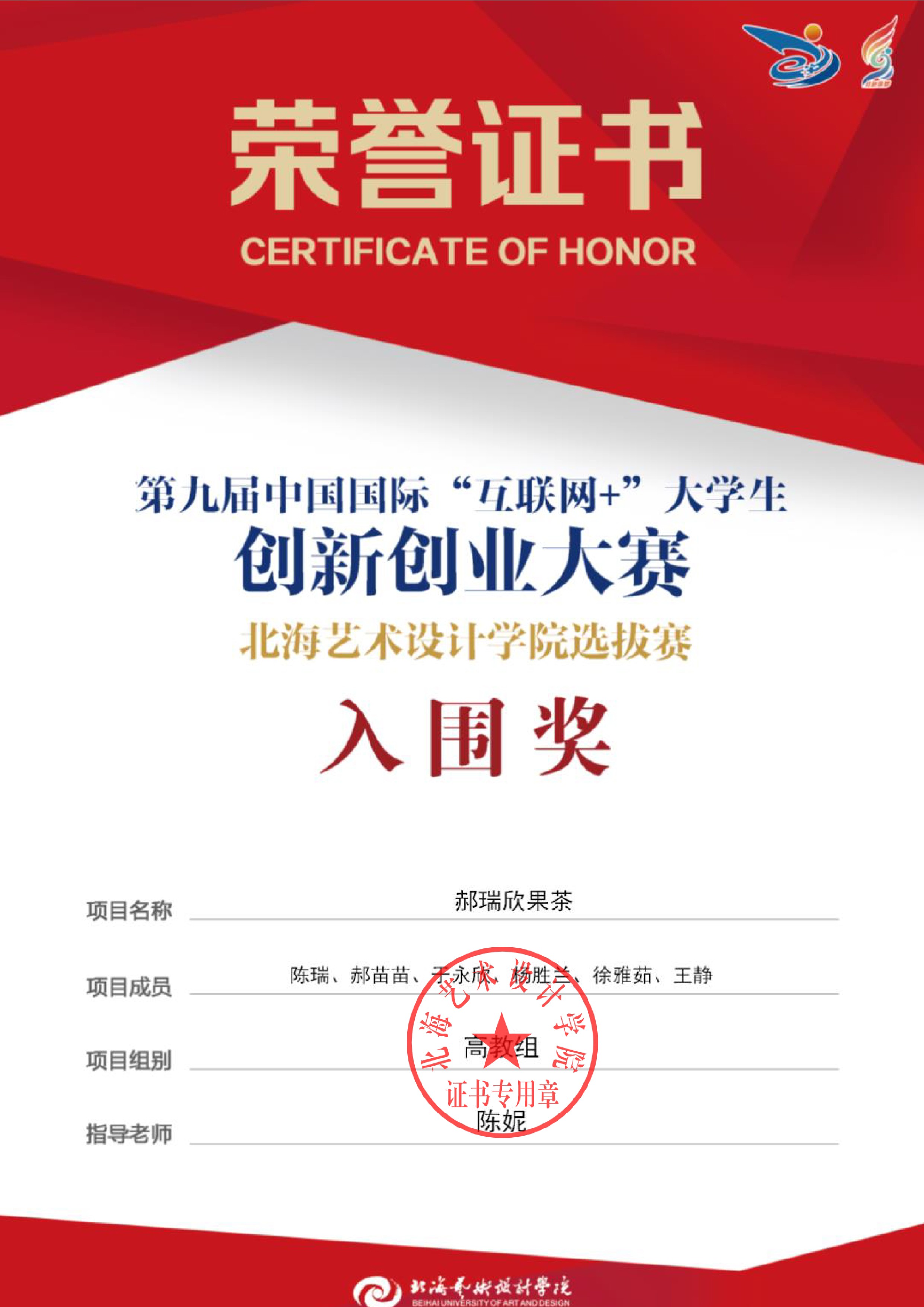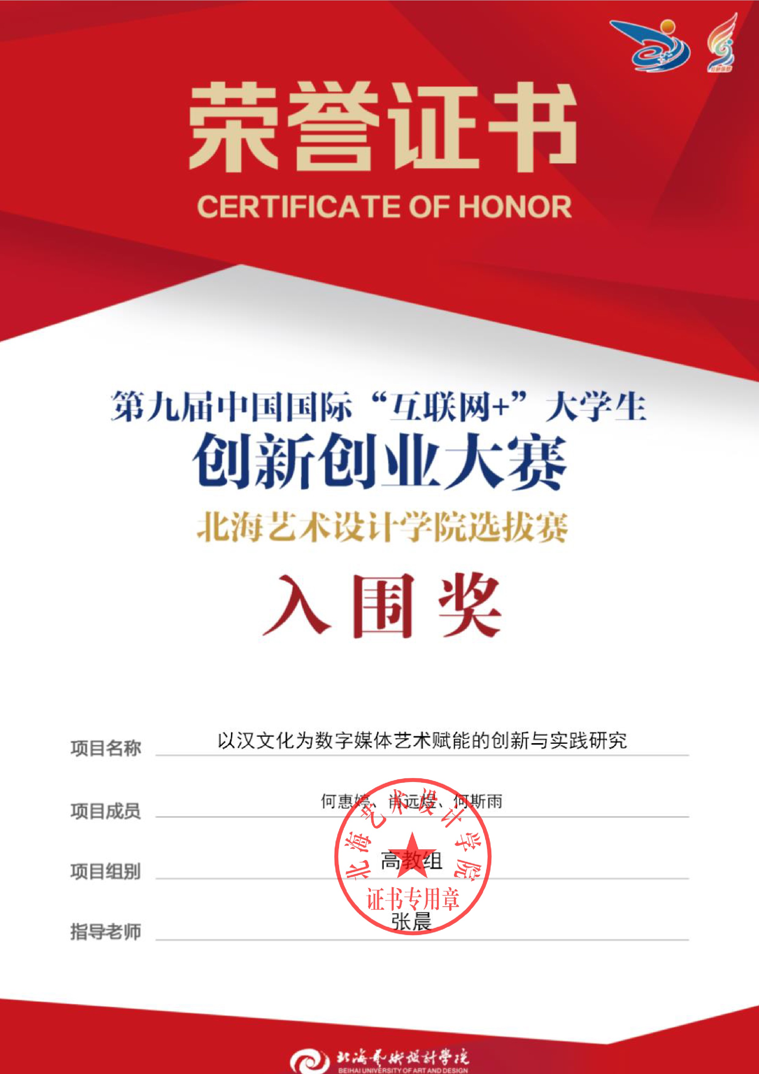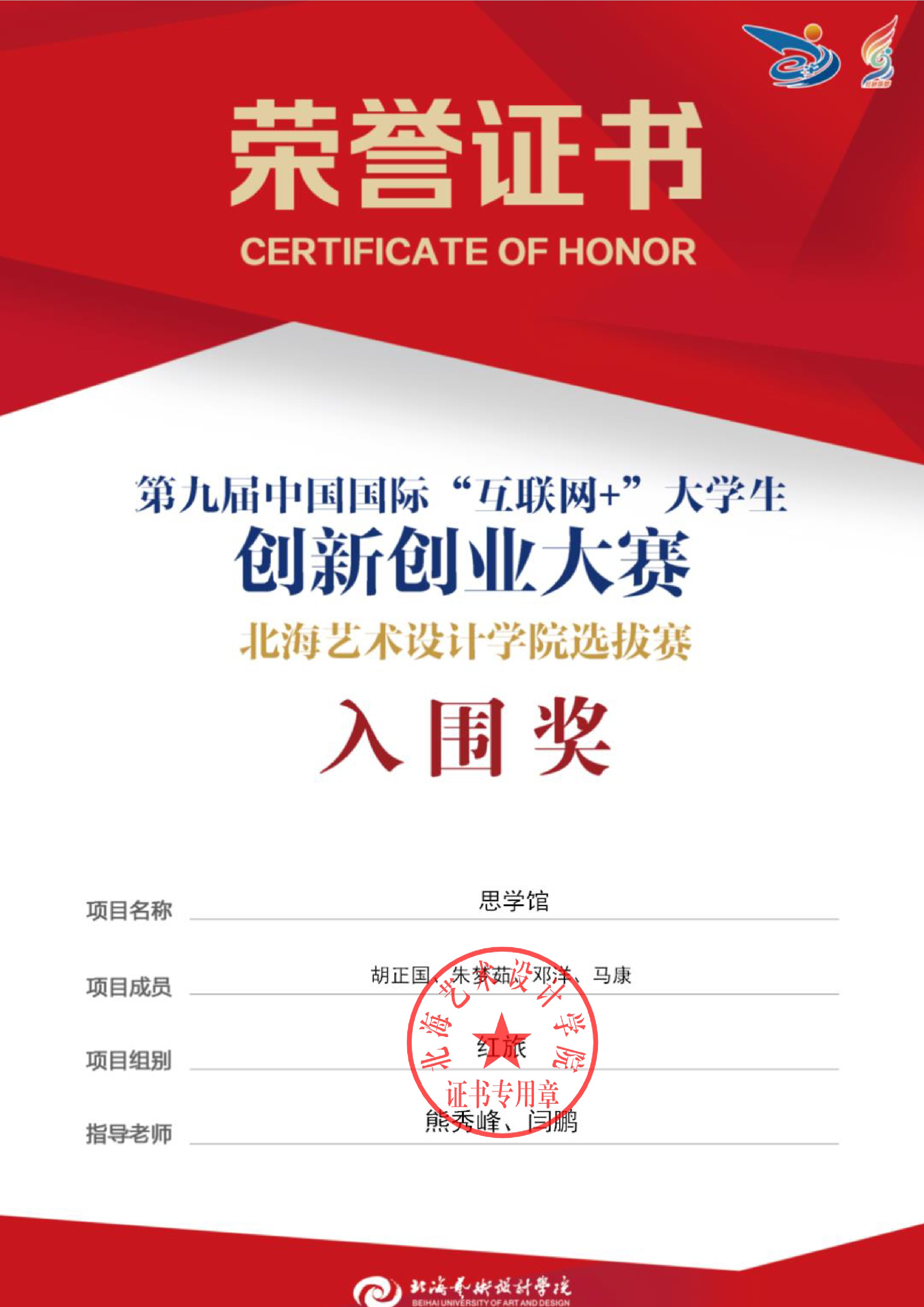 第九届中国国际互联网+大赛校级证书