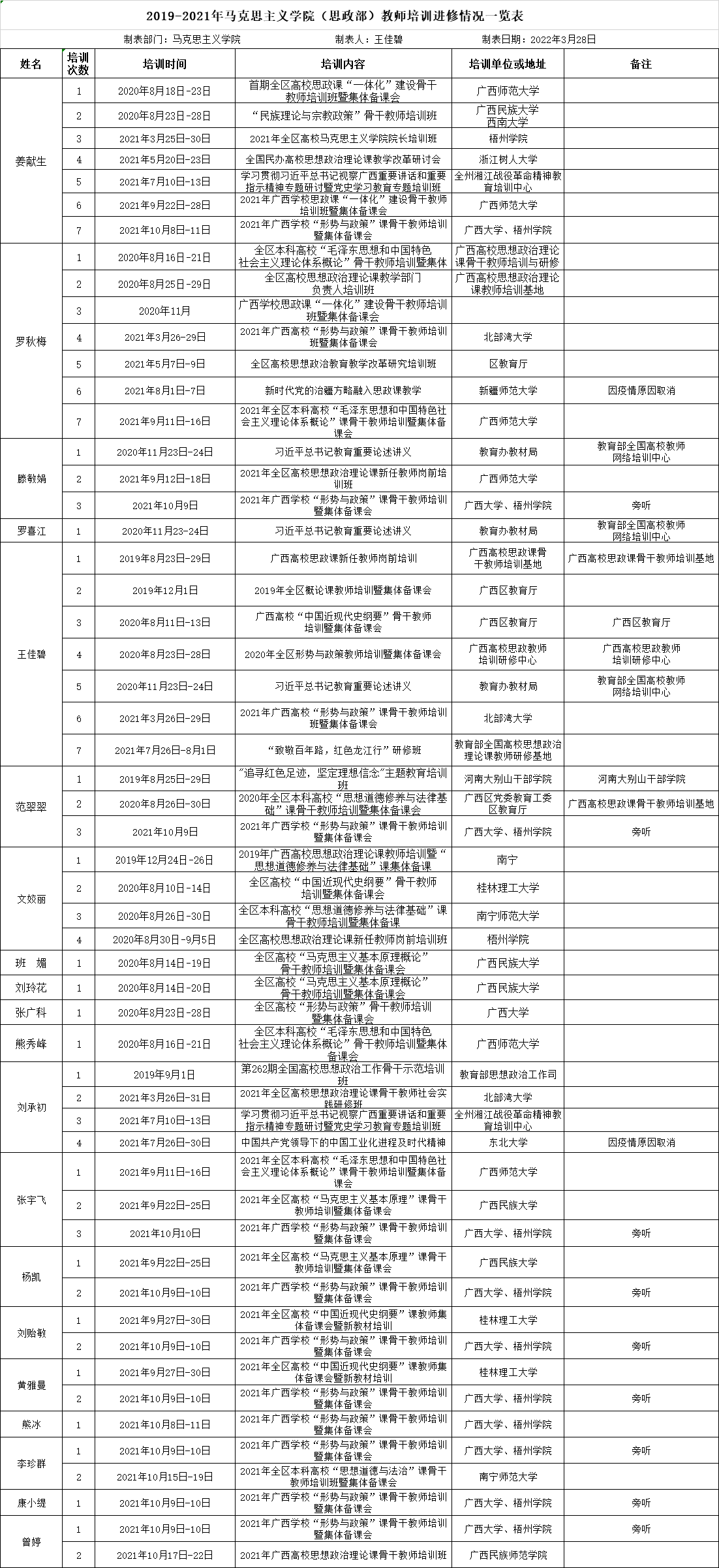 2019-2021年马克思主义学院教师培训进修情况一览表