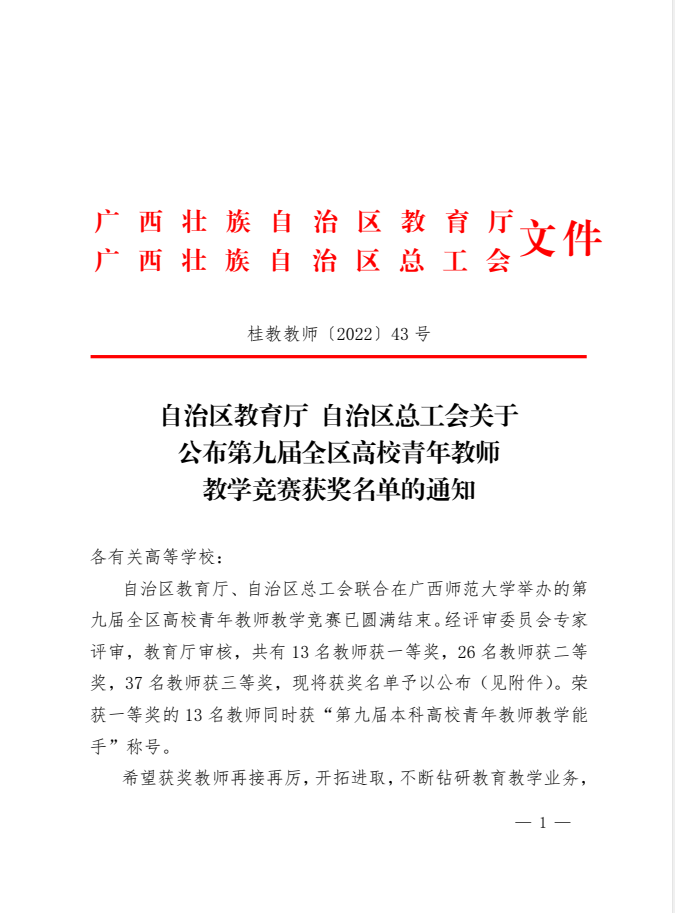 • 桂教教师〔2022〕43号自治区教育厅自治区总工会关于公布第九届全区高校青年教师教学竞赛获奖名单的通知.pdf