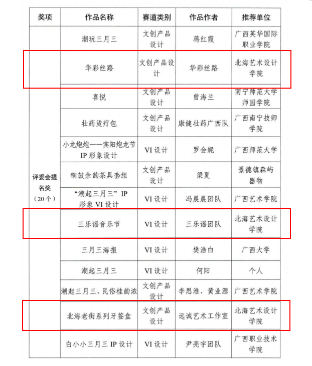 近日,由自治区党委宣传部、自治区教育厅、自治区文化和旅游厅联合举办的2024“潮起三月三”创意设计大赛公布了获奖名单,我校有《华彩丝路》、《三月谣音乐节》《北海老街系列牙签盒》3项作品荣获评委会提名奖。此外,北海艺术设计学院也荣获了优秀组织奖。