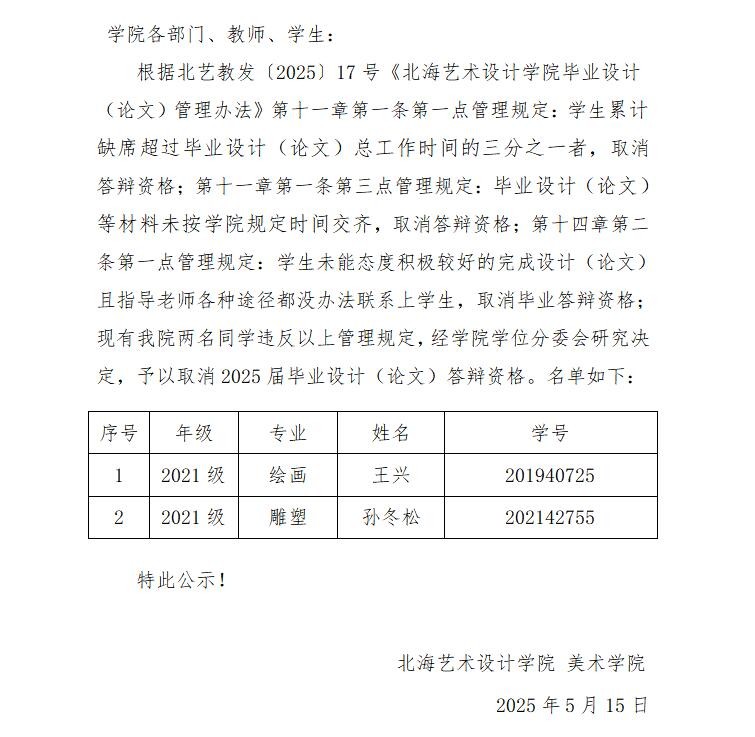 美术学院关于取消2025届毕业生毕业设计(论文)答辩资格学生名单的公示