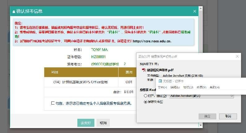 弹出支付确认窗口同时,页面会弹出《健康情况声明书.pdf》下载页面: