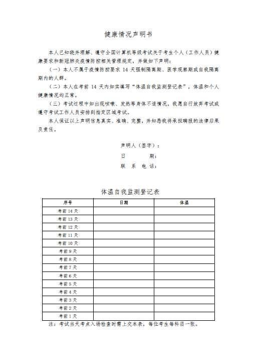 13.在新冠肺炎疫情常态化防控时期,考生须严格遵守各级疫情防控规定,做好个人防护,确保安全。考生应在当次考试前14天起,每日自行监测体温并填写“体温自我监测登记表”(每位考生每科目一张)。考生在考试当天入场检查时,须上交“体温自我监测登记表”与“健康情况声明书”(报名系统中下载)。