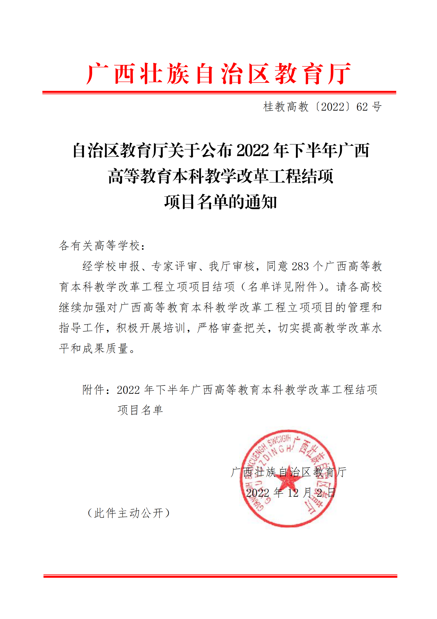 桂教高教〔2022〕62号自治区教育厅关于公布2022年下半年广西高等教育本科教学改革工程结项项目名单的通知