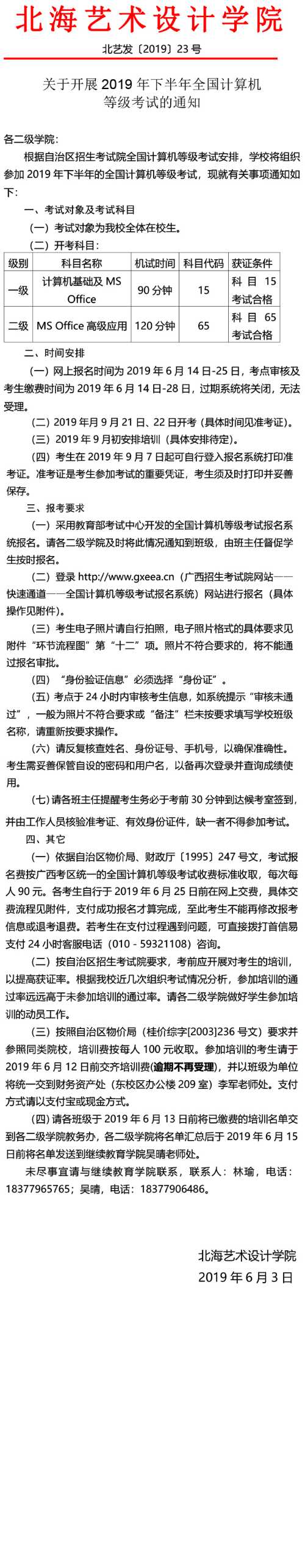 关于开展2019年下半年全国计算机等级考试的通知
