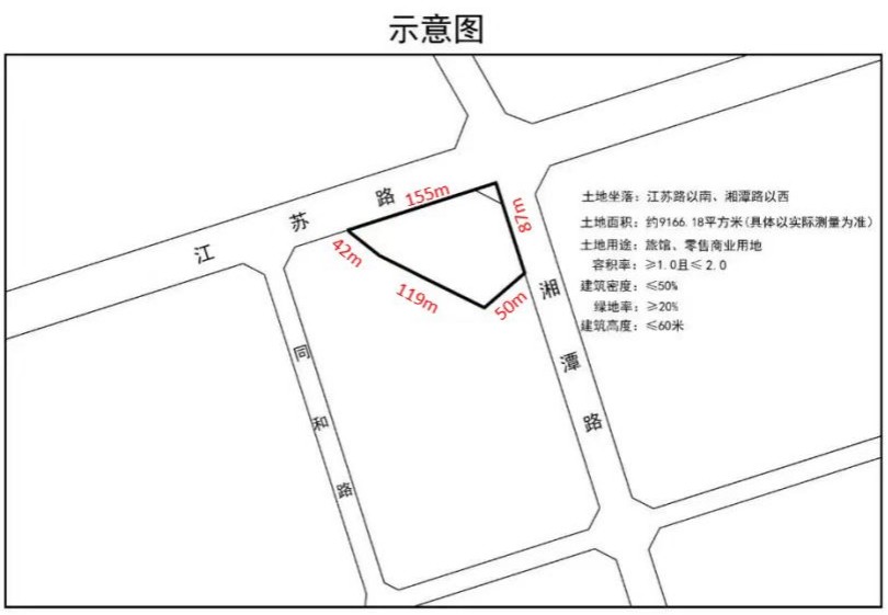 考察地点位于江苏路以南、湘潭路以西的约9166.18平方米土地,被规划为旅馆与零售商业用地,需满足容积率在1.0至2.0之间、建筑密度小于50%、绿地率超过20%以及建筑高度不超过60米的条件,旨在打造集住宿与购物功能于一体的综合性商业区域。