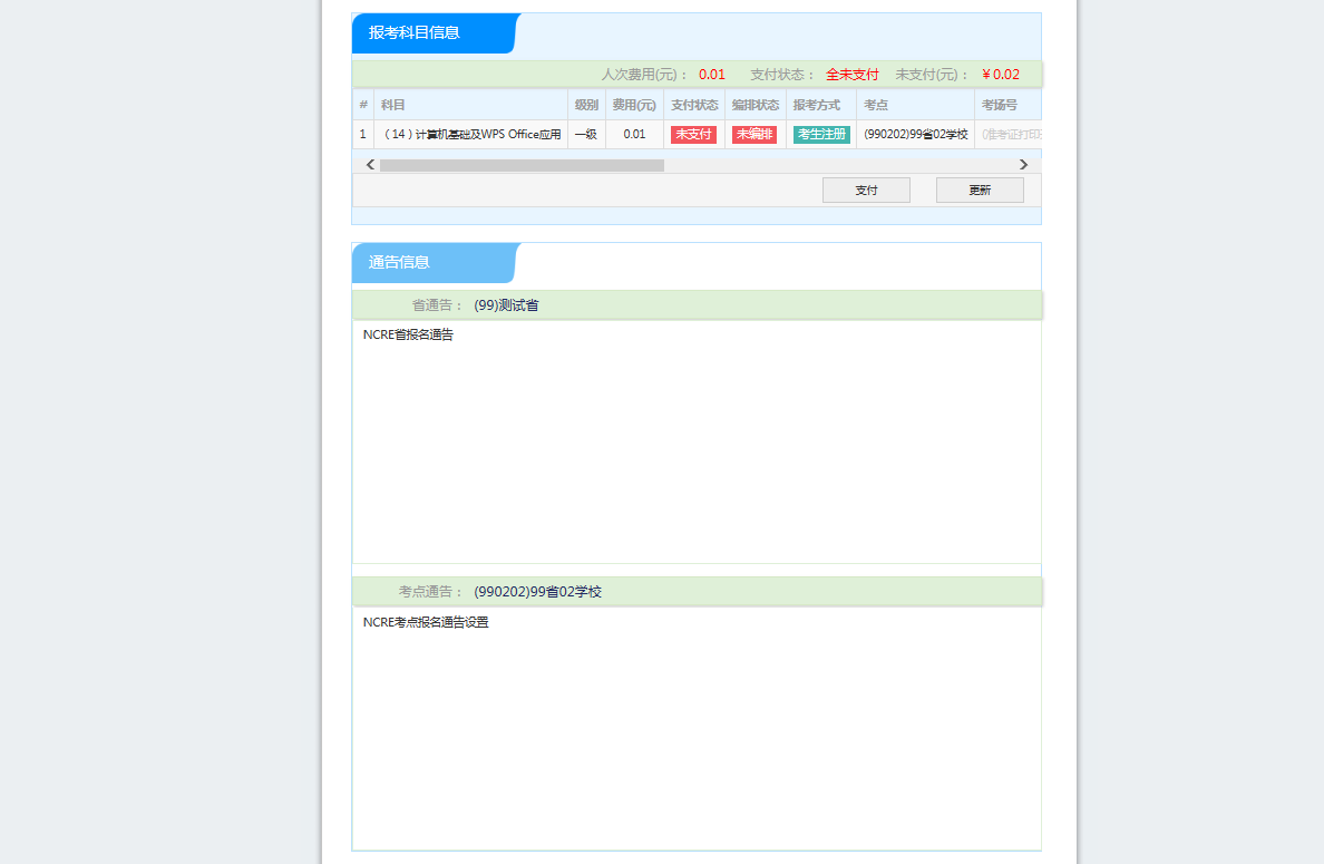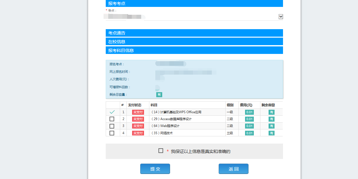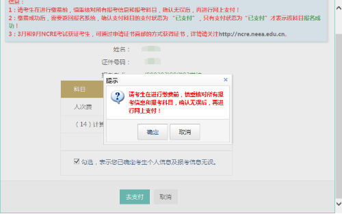 2.支付成功后报名流程完成,考生不能修改个人信息、科目信息或退考退费。