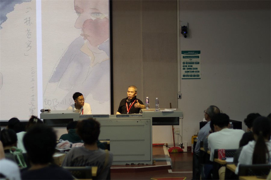 在讲座正式开始前,王少军教授播放了一段名为《角儿的诞生》的视频,通过水彩画作品以及独白,展现他个人的成长之路与经历,分享他在创作原创人物“角儿”过程的心得与感想,带领现场师生大致了解“角儿”这一艺术形象的创作过程,更加深刻地认识这一人物形象。