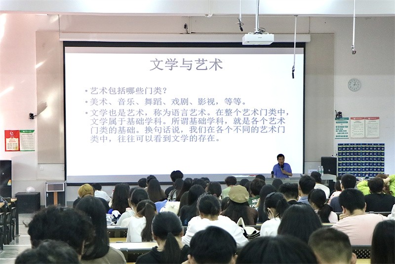 紧接着,黄伟林教授着重分享了诗人艾青的诗歌《我爱这土地》,并分析这首诗歌如此感人的两个原因,其一是诗歌形象生动地表达出中国人潜藏在内心深处的爱国之情,唤醒读者内心的祖国形象,激活了读者内心的深厚爱国之情;其二是诗歌在表层的意象下隐藏了潜意识层面能感知的深层意象。黄伟林教授现场播放该音乐舞蹈,带领现场师生体会诗歌转换成舞蹈艺术的魅力,进而说明文学是艺术创作的重要资源。
