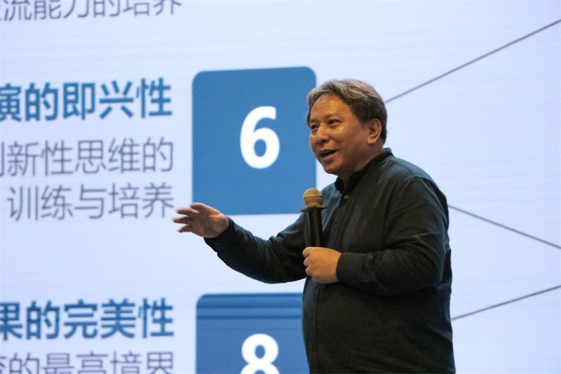 安平教授还讲述了“合唱剧”课程与“音乐剧”排演的区别。他分别从创作的目的、规模、方式以及复杂程度做出了简要说明,随后通过互动,并以合唱剧《鸿雁》作为案例展开了详细的解说,细致展示了中国民族的音乐之美。安平教授从人声的主导性、节奏的重要性、音色的丰富性、内容的世界性、形式的融合性、表演的即兴性、审美的过程性、结果的完美性等八个方面对“合唱剧”课程的特色进行了着重分析介绍。