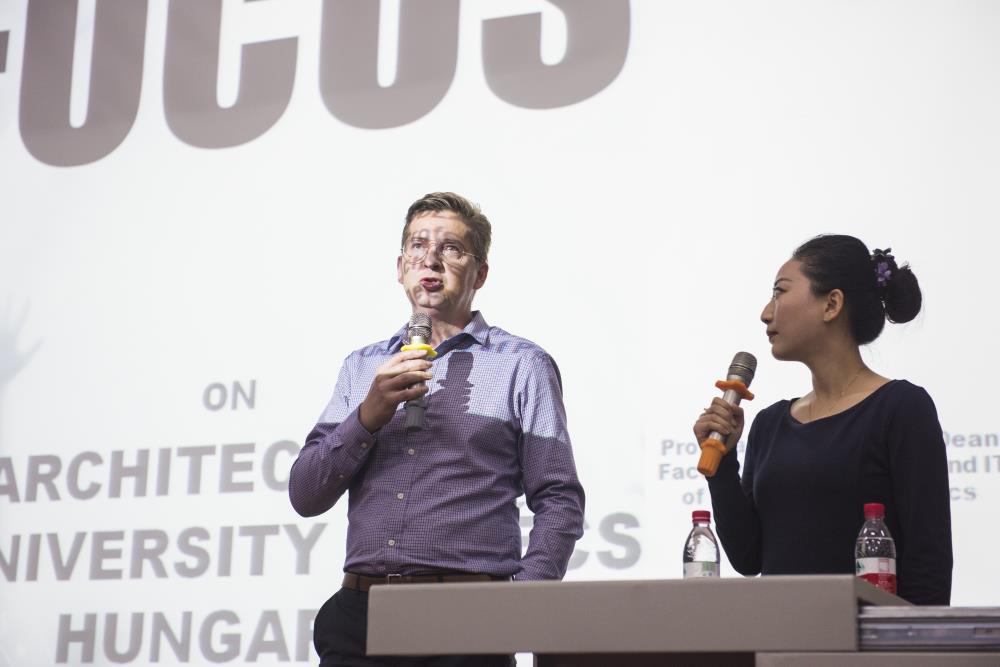 讲座中,Balint教授区别了欧洲和中国不同的设计理念:欧洲国家建筑设计擅于将新材料和新建筑与自然理念相结合,中国则往往是通过传统风格与现代技术相结合进行建筑设计。随后Balint教授用详细的案例给大家解释道:由于匈牙利曾经被各国殖民,所以在匈牙利能够看到不同风格特色的建筑设计。Balint教授还结合相关设计,介绍了他所在的工程与信息建筑学院“专注能源,建筑设计作品是与周边环境,温度相结合以节能环保为主”的设计学习方向,并向学生们展示了佩奇大学学生所设计出来的作品。Balint教授告诉大家:建筑设计师需要的是创造性思维和综合能力,要学会相互合作。