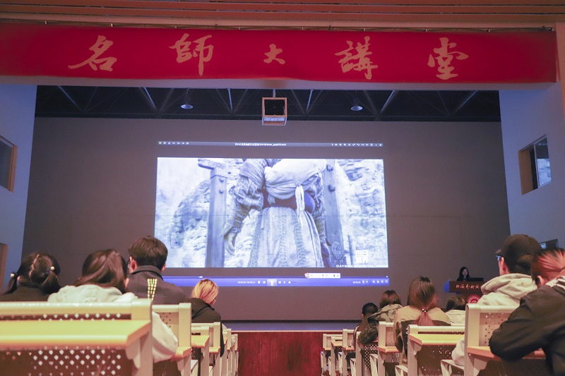 随后,许俊红播放了她所参与制作的游戏CG宣传片:《传奇》、《青云志》、《大唐无双》、《补天记》等,给在场师生以强烈的视听震撼。播放时,通过成品视频与原画的对比,具体阐述了人物及配饰的具体制造及效果手法,向大家介绍新要点——动作捕捉,在场的同学们听的津津有味。