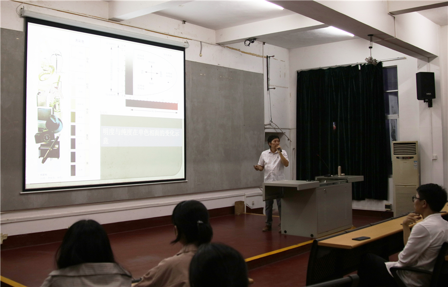 接下来,张玉祥教授以色彩基础的色相、纯度、明度三大要素讲起。张教授以其学生作业为例,其中有的对比强烈,颜色分明;有的柔和多彩,格外优美。让我们感受到了不同色彩的结合所带来的魅力。