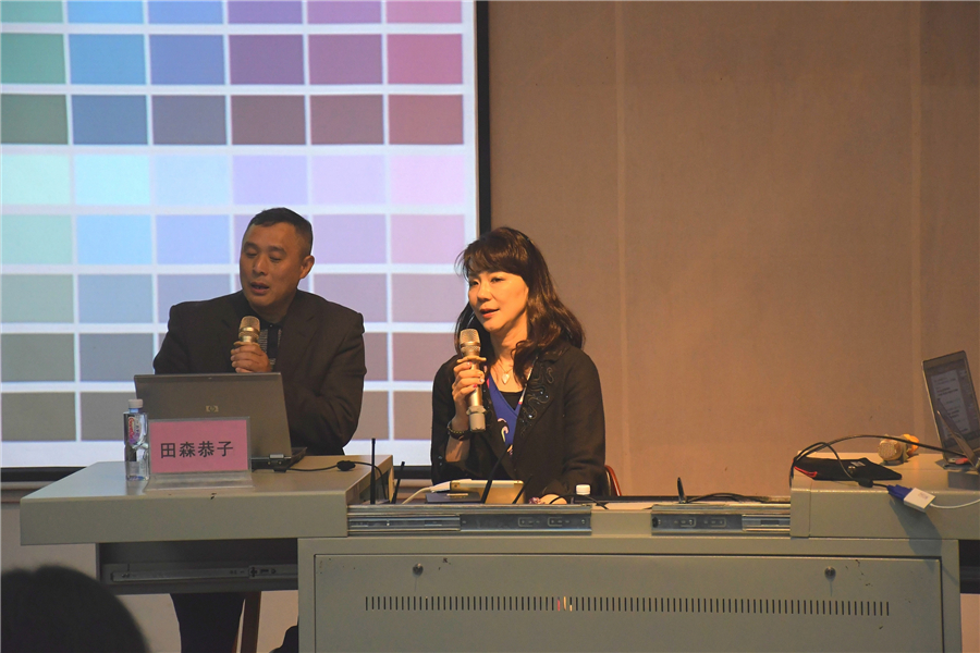 田森恭子女士围绕“最新配色使用的色彩表达系统开发”展开讲解。她从美国色彩科学之父费伯·比伦创立的CMYK颜色系统理论讲起,告诉我们如何认识色号和运用相关的色相记号。她认为色彩需要想象和设计创作,要有浓厚的兴趣才能做好。