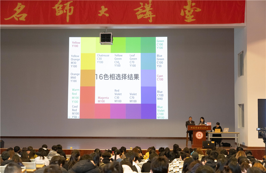 讲座过程中,田森恭子女士结合了16色相14种明彩度一览表、搭配颜色等式相面图,详细地为大家介绍了各种颜色和明彩度如何在CMYK系统中配比出来,进而利用印刷颜色指定价值。从讲解中,同学们感受到只有将色彩比例参数牢记于心,今后的设计过程中色彩应用才会得心应手。