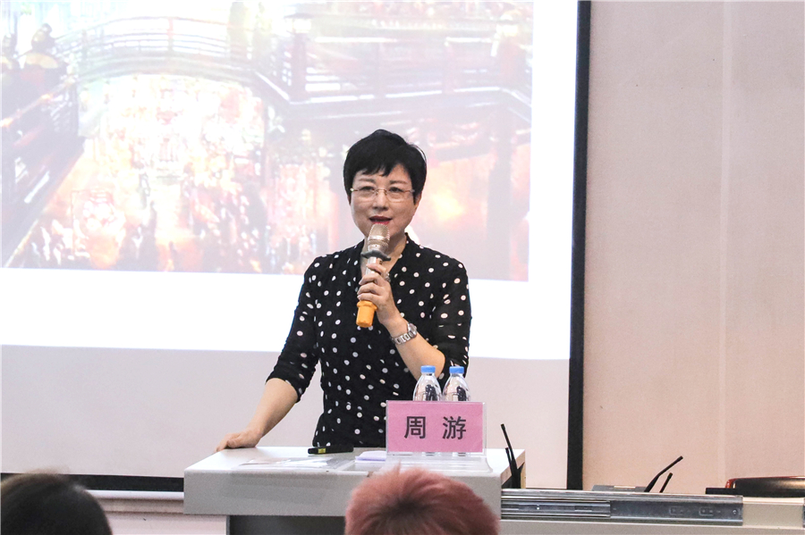 周游教授用诗句开篇,引导同学们一起学习朗诵与如何更好地将诗歌导入情感,希望同学们能先感受美,再体现美。谈到诗歌,周游教授以岑参、王维等古代诗人、唐代边塞诗为例,讲述诗人通过诗句来表达感情,诗歌可以言志,言情,作为语言工作者要用情、用爱传递声音。