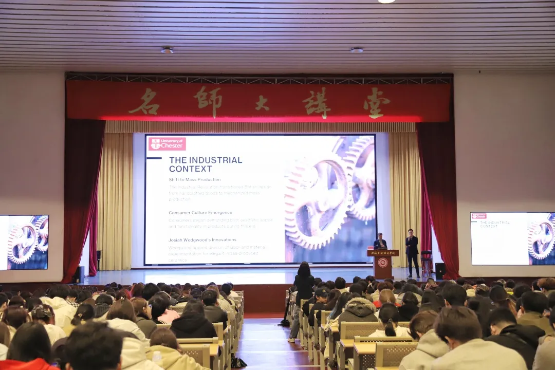 为深化中外艺术设计领域交流,拓宽师生国际视野,3月9日晚,英国切斯特大学国际事务常务副校长、英国高等教育学院院士大卫・麦格拉维教授(Professor David McGravie)应邀莅临我校,在西校区大礼堂开展以《链接古今:设计与技术革命的对话&暑期微留学英国大学体验之旅介绍》为主题的专题讲座。讲座由我校常务副校长胡胜主持。