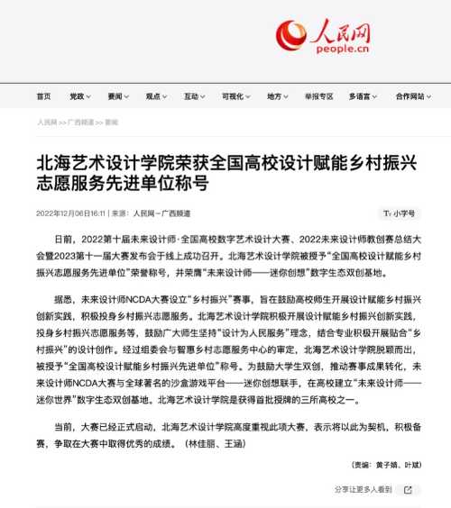 人民网:北海艺术设计学院荣获全国高校设计赋能乡村振兴志愿服务先进单位称号