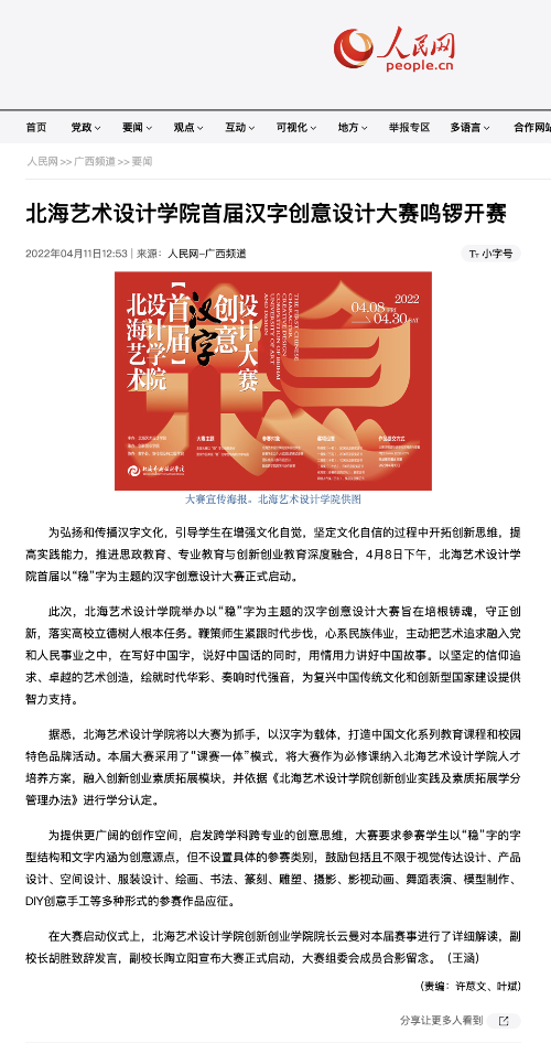 人民网:北海艺术设计学院首届汉字创意设计大赛鸣锣开赛