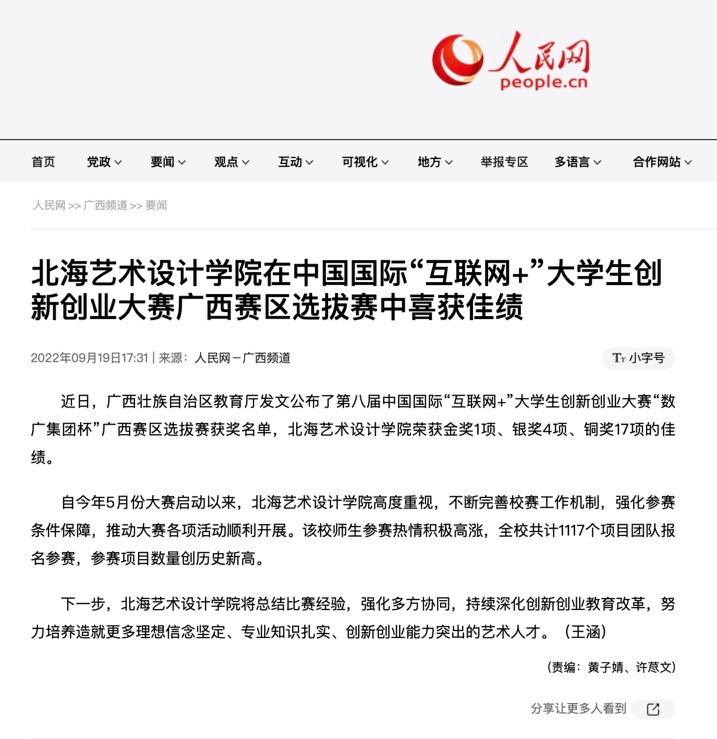 人民网:北海艺术设计学院在中国国际“互联网+”大学生创新创业大赛广西赛区选拔赛中喜获佳绩