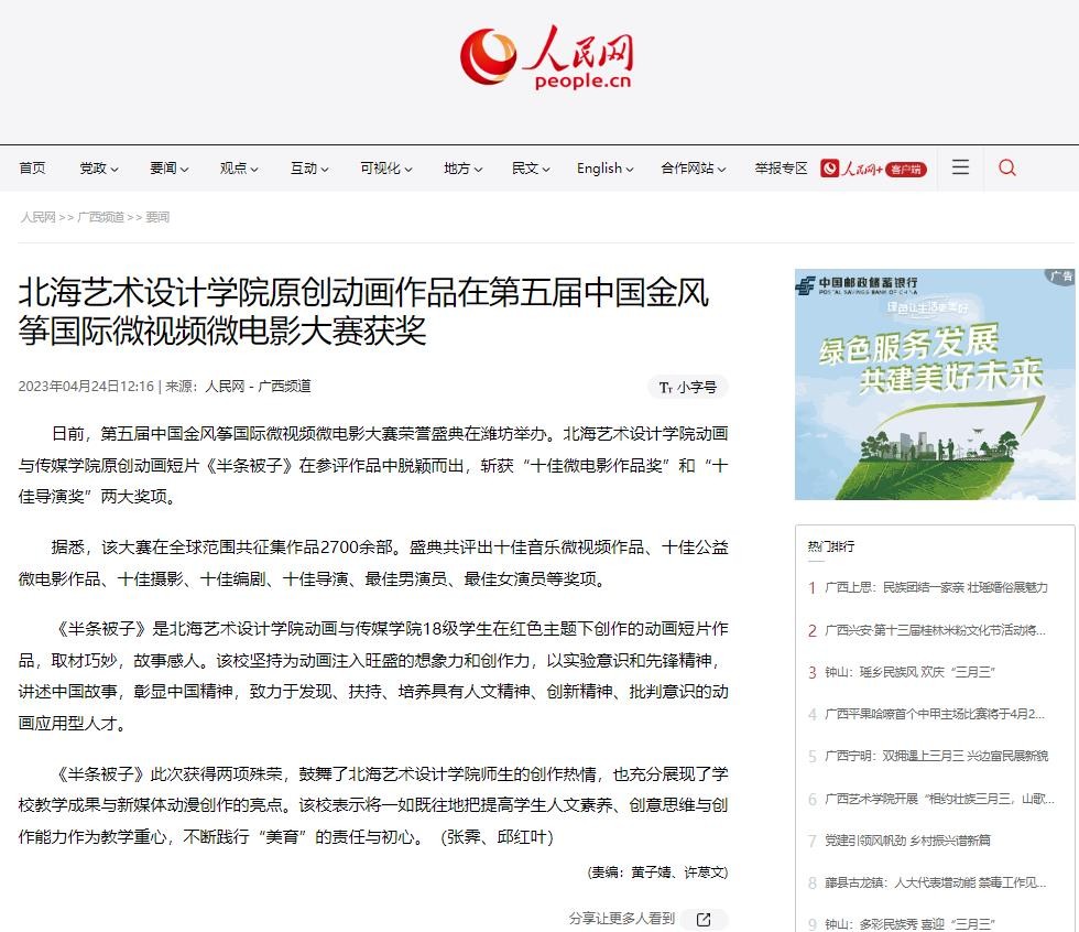 人民网:北海艺术设计学院原创动画作品在第五届中国金风筝国际微视频微电影大赛获奖