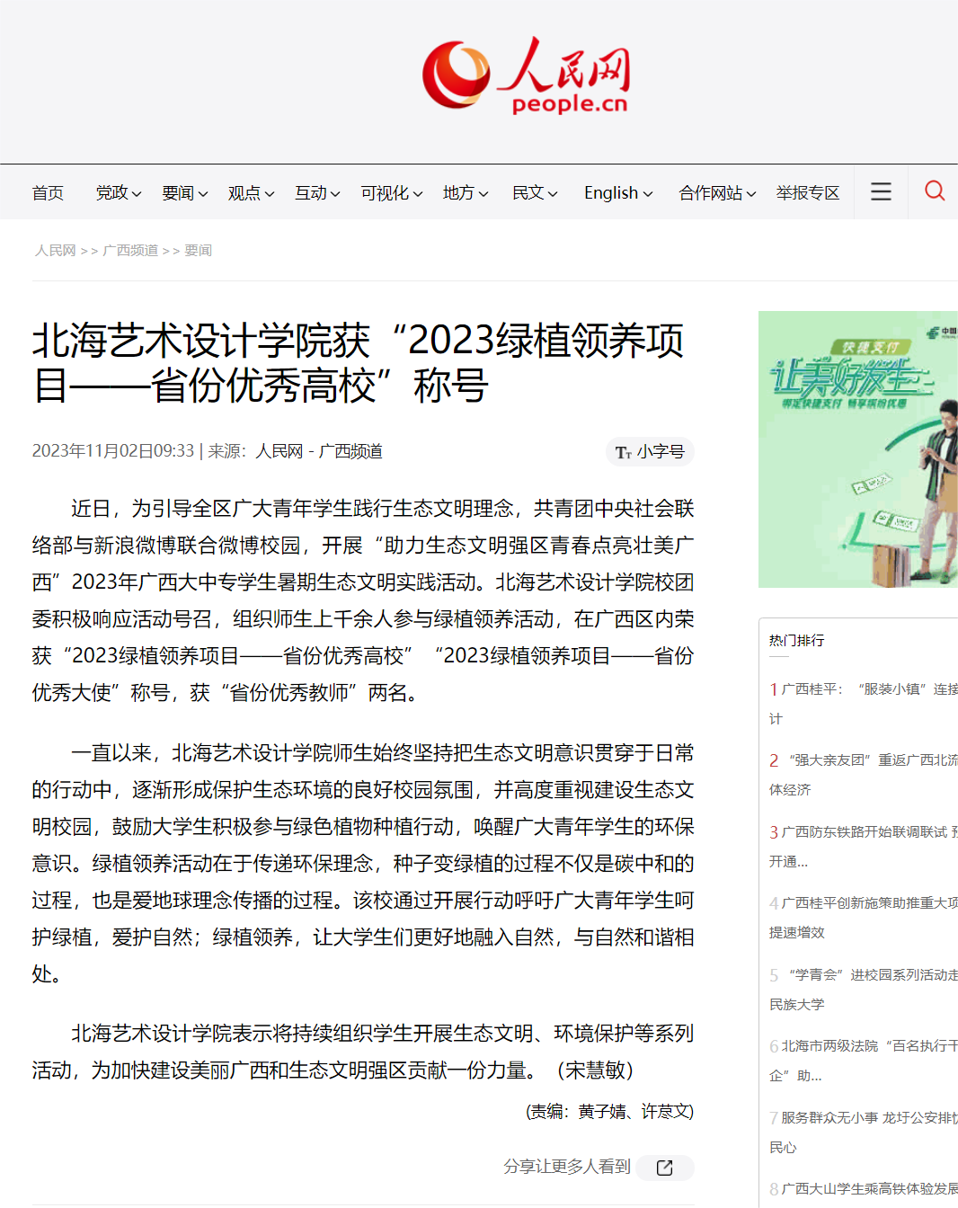 人民网:北海艺术设计学院获“2023绿植领养项目——省份优秀高校”称号