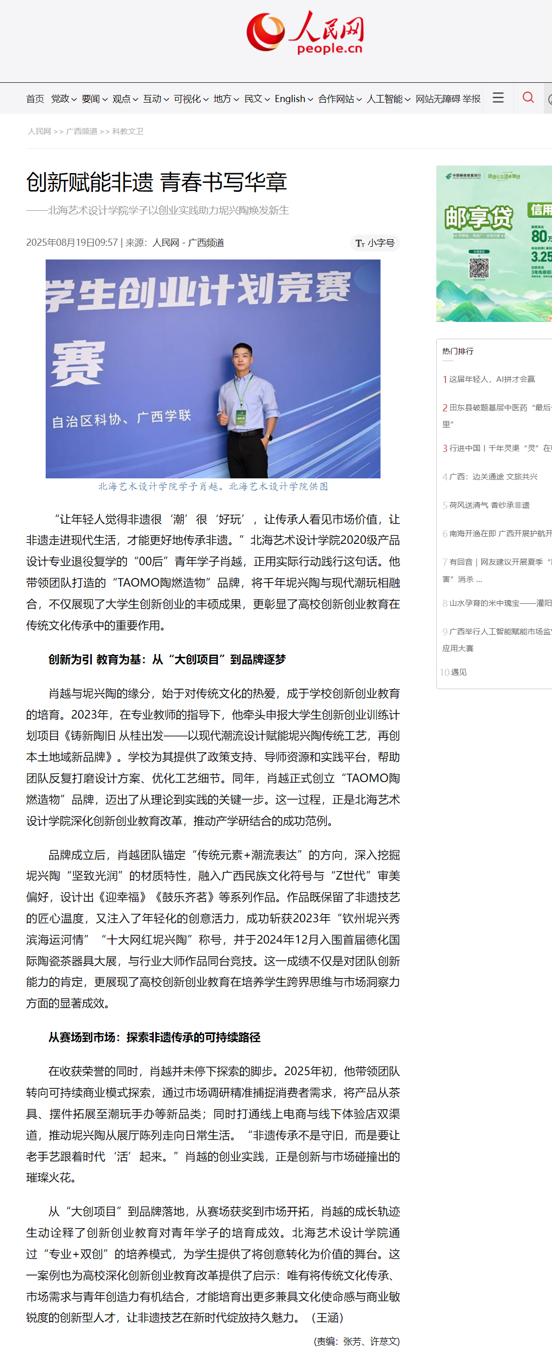 人民网:北海艺术设计学院学生在中国国际大学生创新大赛(2025)广西赛区选拔赛斩获金奖