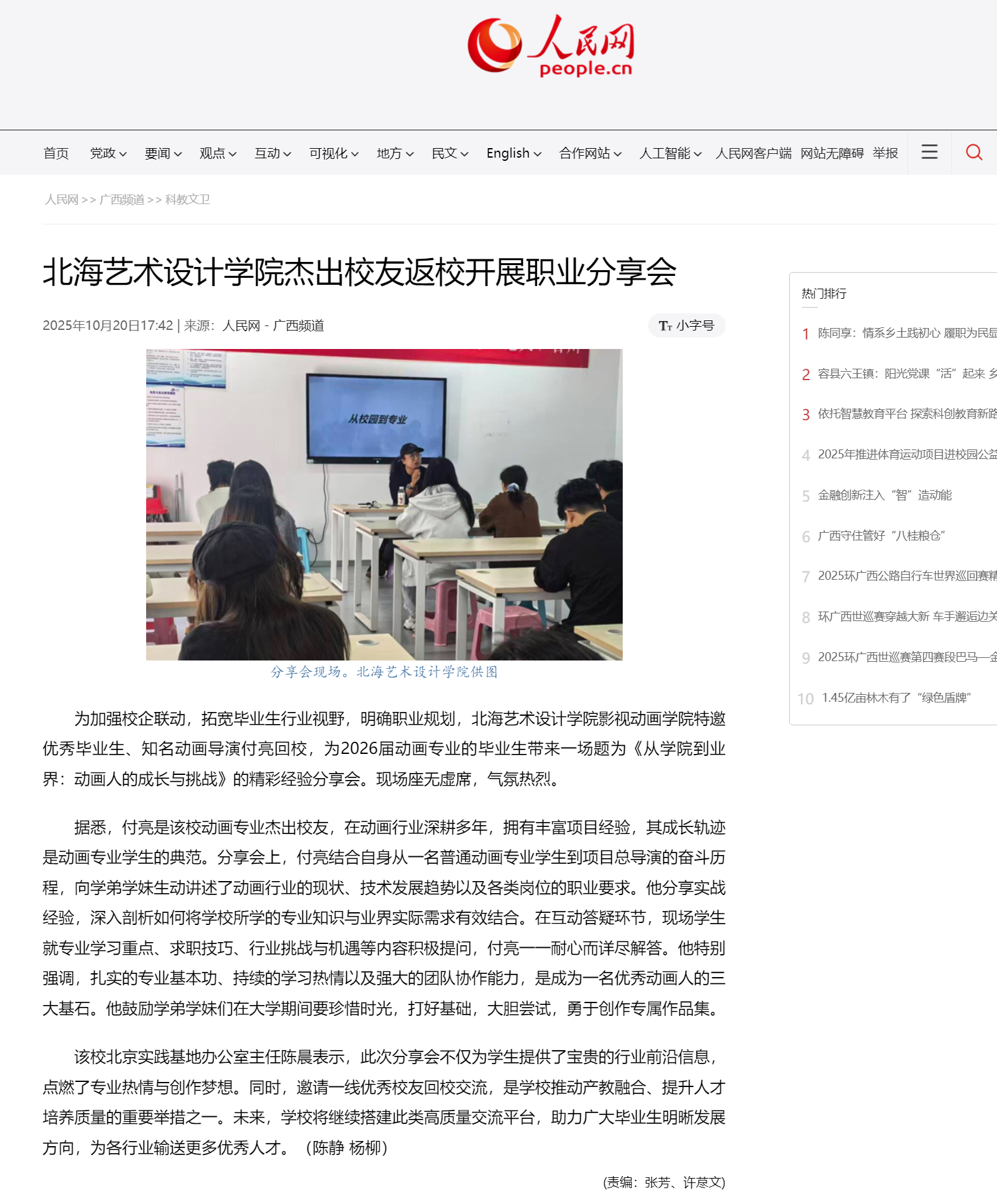 人民网:北海艺术设计学院杰出校友返校开展职业分享会