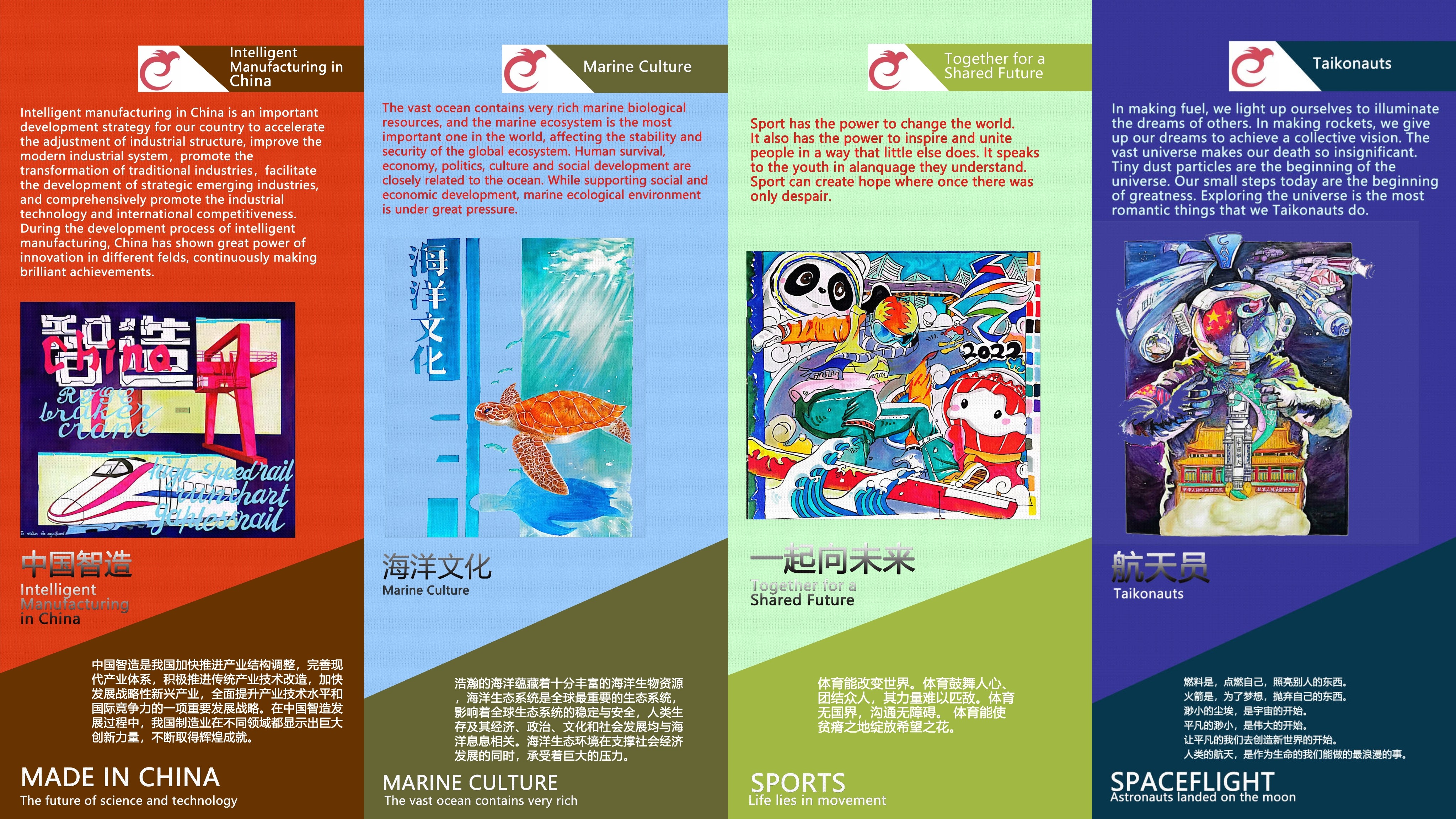 是艺术设计类院校,在英语课堂教学中,我们以课本为依托,以中国传统文化和时政热点为主题,以学生个性化设计为载体,将英语应用于设计过程。所有展览相关的设计都由学生投稿选拔而出。今年共选出1张主海报、8张主题海报、7张宣传海报以及相关作周边设计。
