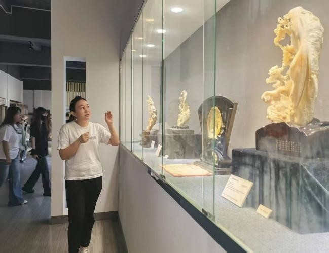 考察的第二站是龚琼辉玉雕博物馆,系统观摩广西特色玉雕南流江玉的工艺,深化传统雕刻技艺与当代艺术融合的认知,‌师生通过玉雕工艺流程的现场解析,学习南流江流域玉石材料的特性与雕刻技法。结合雕塑专业教学需求,重点探讨镂雕、透雕等传统技法在当代造型艺术中的转化路径,强化学生对材质语言的理解能力。