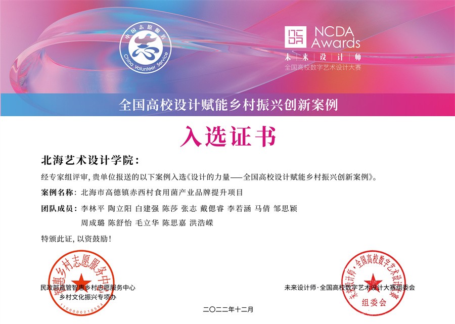 我校在此项活动中被授予“全国高校设计赋能乡村振兴志愿服务先进单位”荣誉称号,同时我校设计赋能乡村振兴创新案例《北海市高德镇赤西村食用菌产业品牌提升项目》和《艺术遇上美丽乡村——北海三角梅旅游扶贫项目》入选设计的力量——全国高校设计赋能乡村振兴创新案例。该荣誉是对我校积极开展设计赋能乡村振兴创新实践,投身乡村振兴志愿服务方面取得成果的肯定,同时也激励老师同学们继续以“设计为人民服务”结合专业积极开展乡村振兴的设计创作。