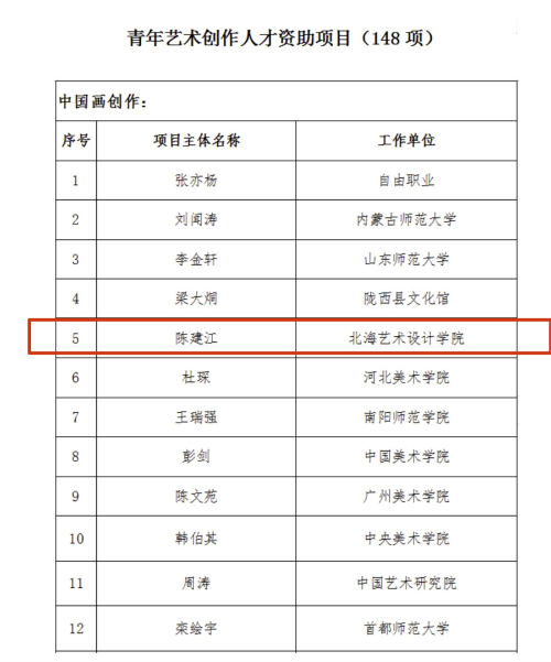 3月3日,国家艺术基金管理中心发布《国家艺术基金(一般项目)2023年度资助项目名单公示》,我校美术学院教师陈建江获青年艺术创作人才项目(中国画创作)立项,这也是我校唯一在获得此类立项的项目。