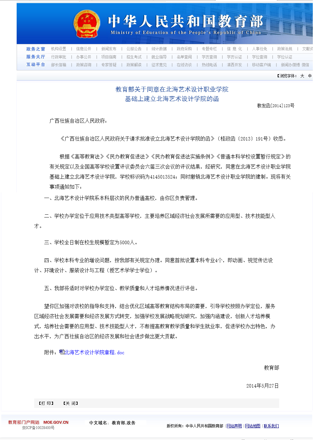 《广西壮族自治区人民政府关于请求批准设立北海艺术设计学院的函》(桂政函〔2013〕191号)收悉。
